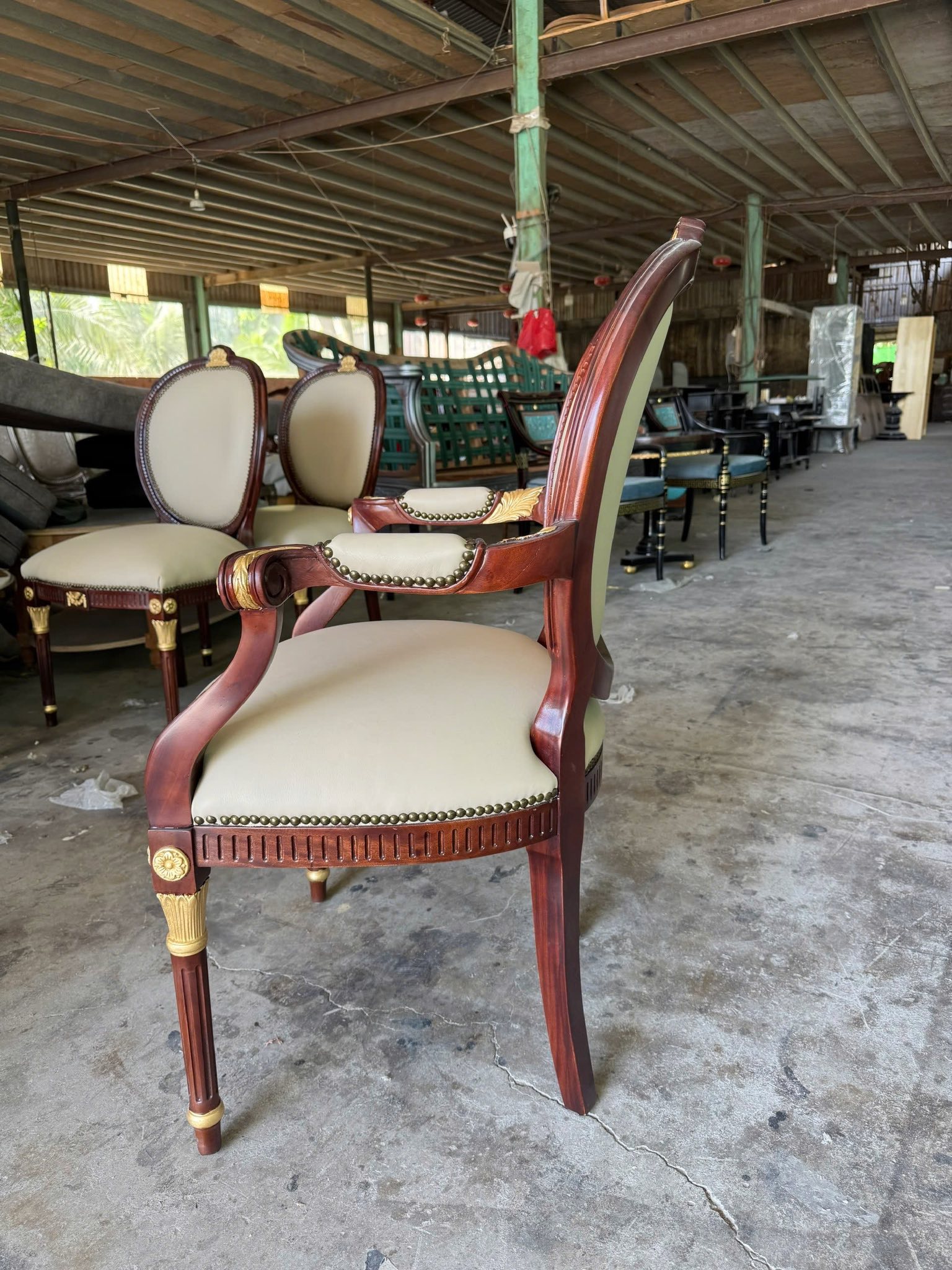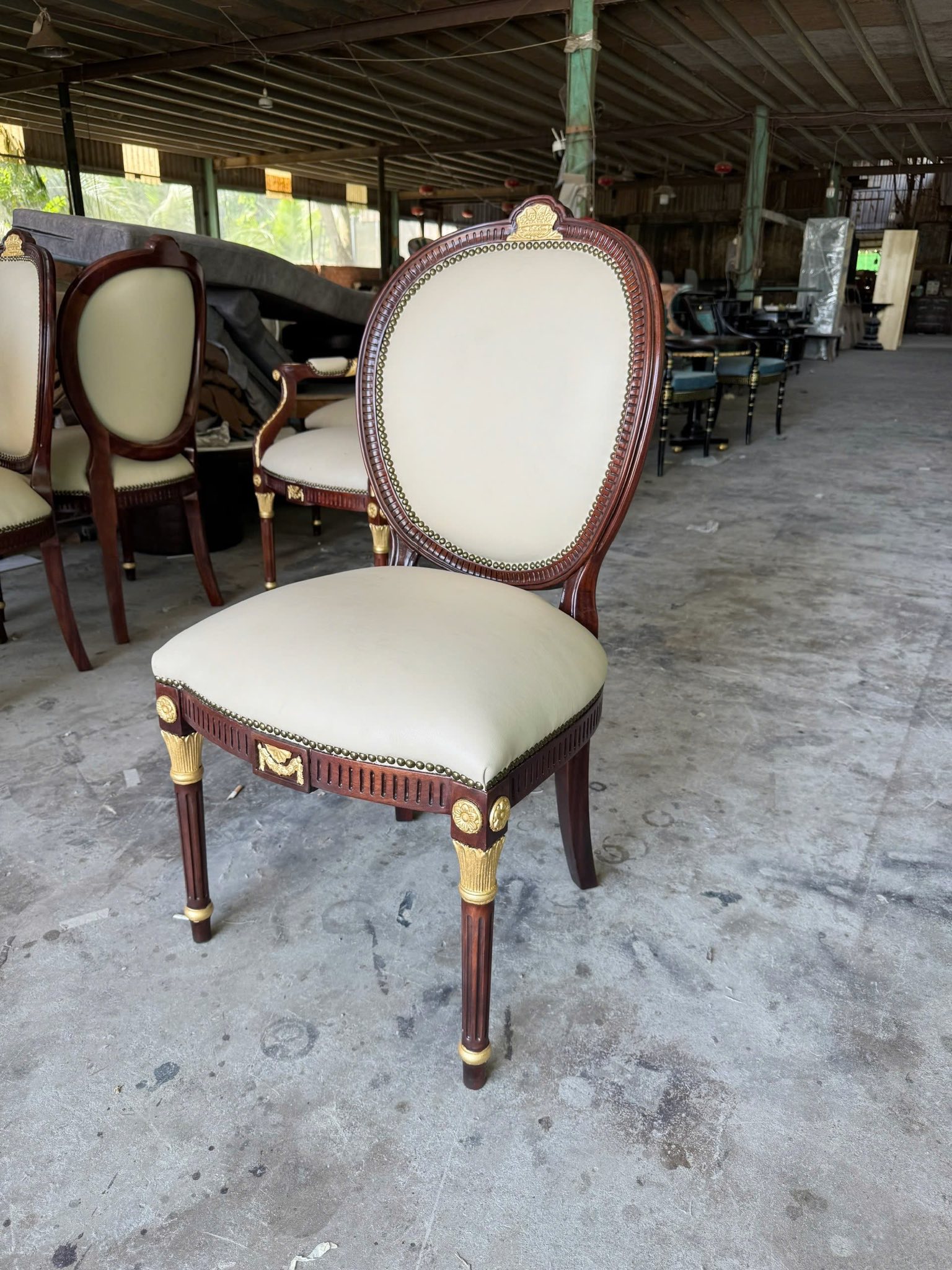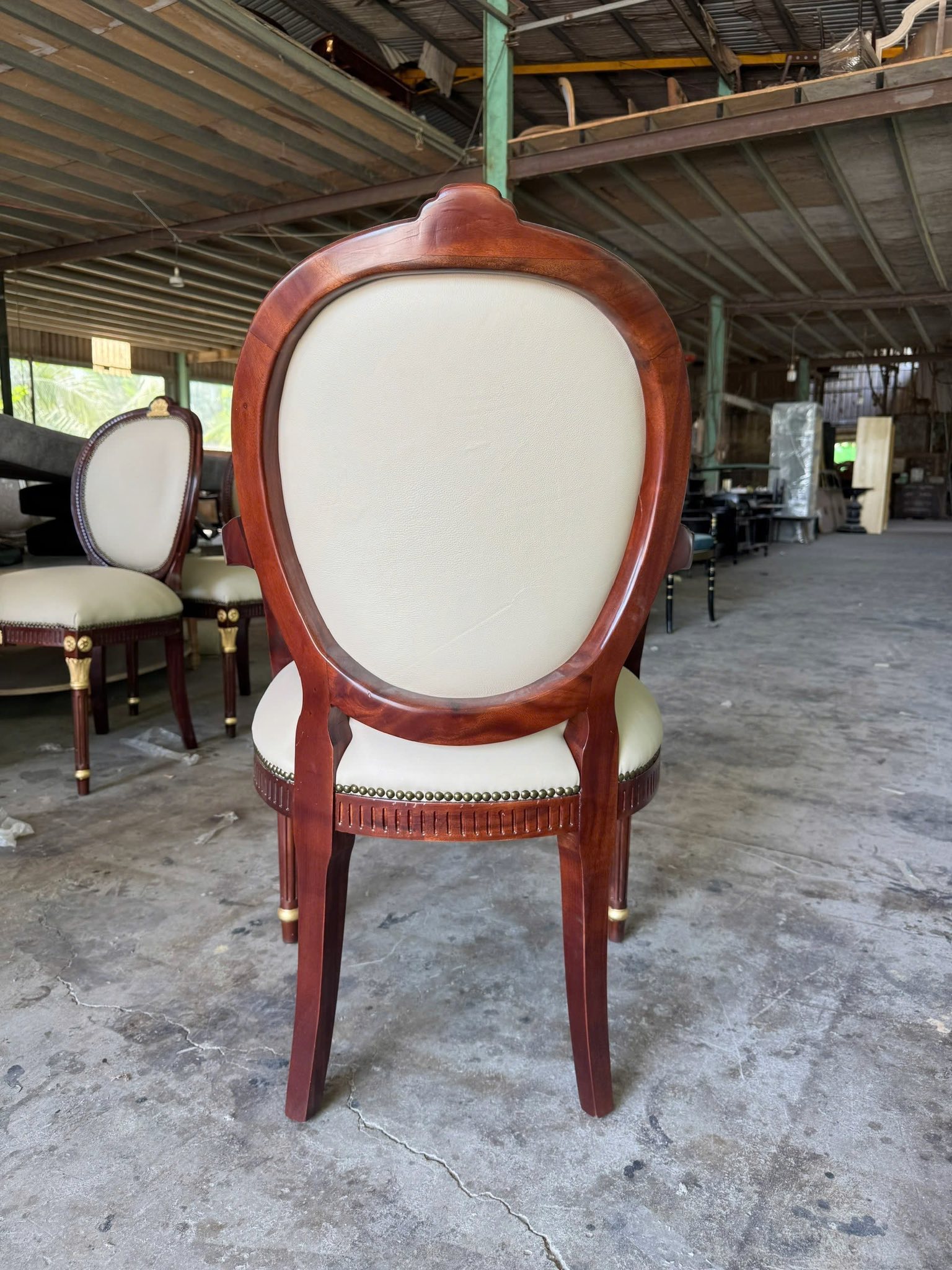 Đi kèm với bàn là 10 ghế Louis mang phong cách cổ điển châu Âu. Thiết kế ghế nổi bật với phần tựa lưng uốn cong mềm mại, tạo cảm giác thoải mái khi ngồi. Các chi tiết chạm khắc được thực hiện tỉ mỉ, góp phần tạo nên tổng thể hài hòa và đẳng cấp.