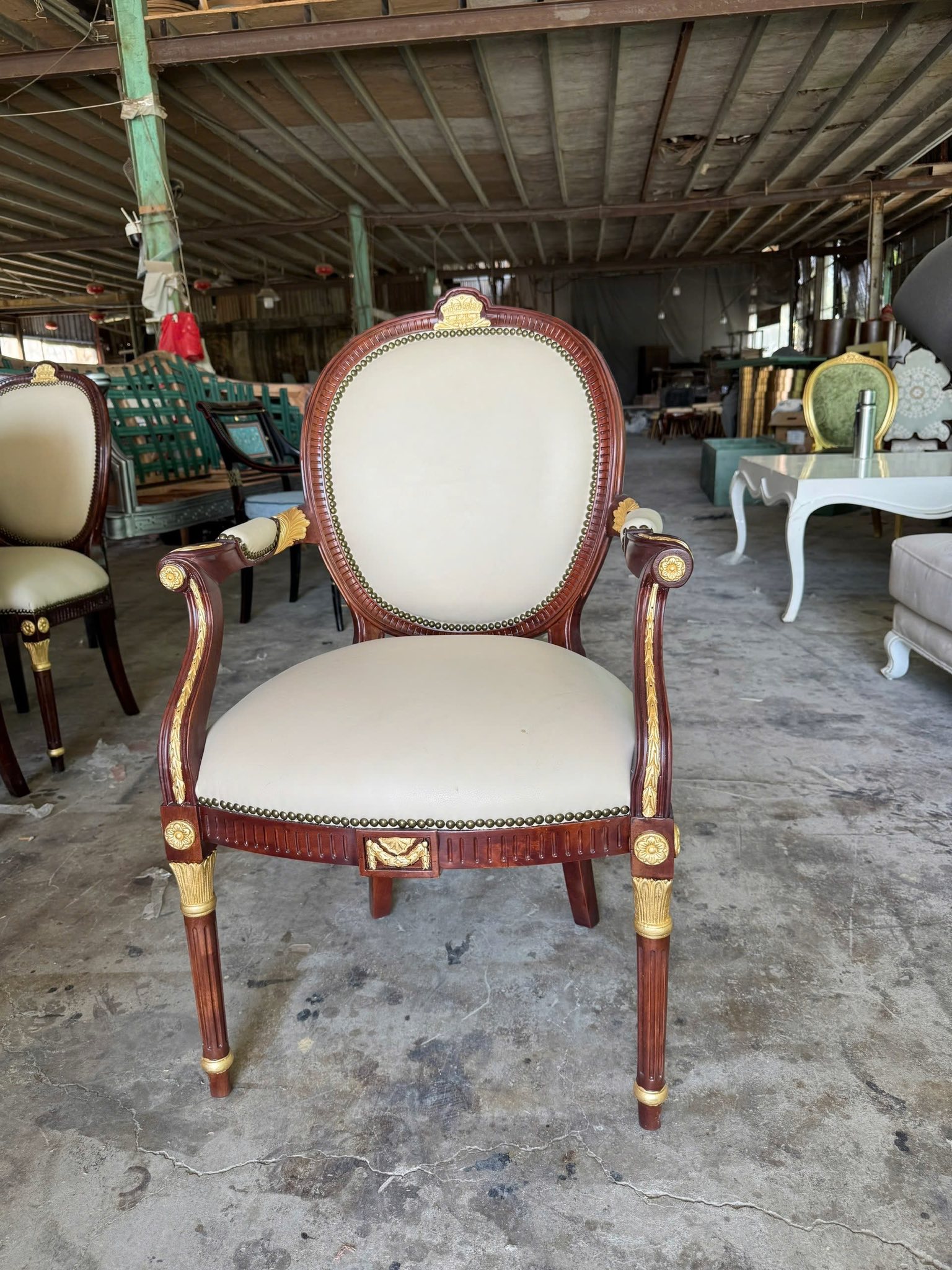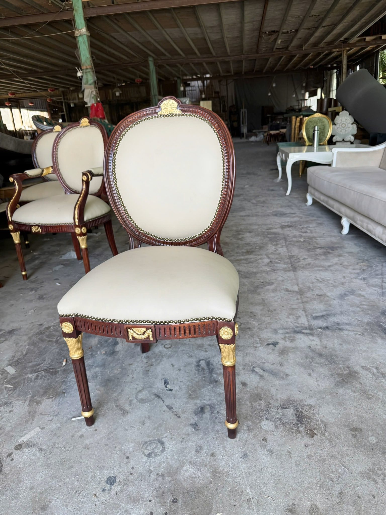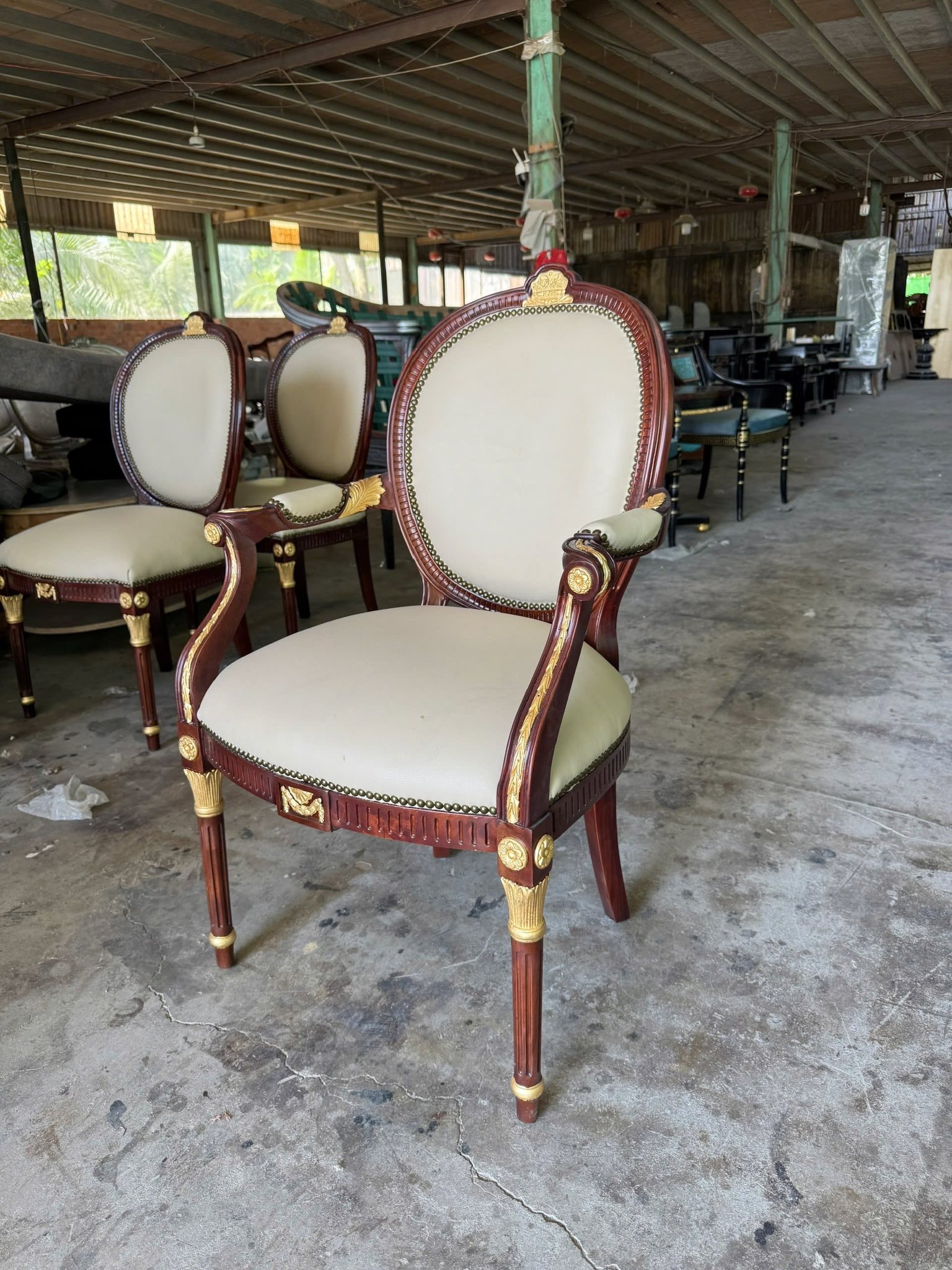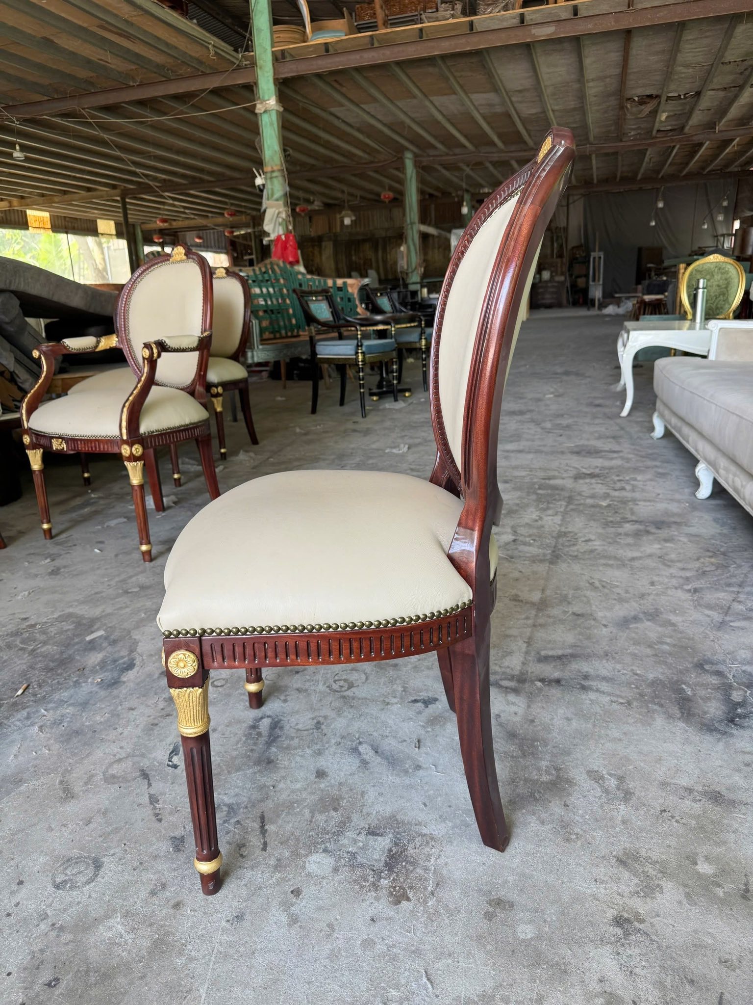 Đi kèm với bàn là 10 ghế Louis mang phong cách cổ điển châu Âu. Thiết kế ghế nổi bật với phần tựa lưng uốn cong mềm mại, tạo cảm giác thoải mái khi ngồi. Các chi tiết chạm khắc được thực hiện tỉ mỉ, góp phần tạo nên tổng thể hài hòa và đẳng cấp.