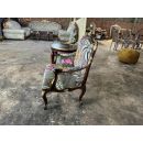 Bộ ghế louis 15 dùng gỗ mahogany lên màu walnut, một số chi tiết hoa văn chạm trổ dán lá đồng, ghế bọc vải in rừng cây vui nhộn cao cấp.