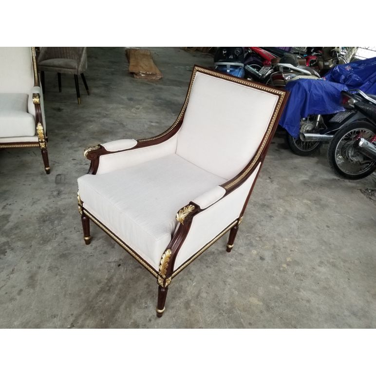 Bộ ghế sofa dùng gỗ óc chó, một số chi tiết chạm trổ dát vàng, ghế bọc vải bố cao cấp.