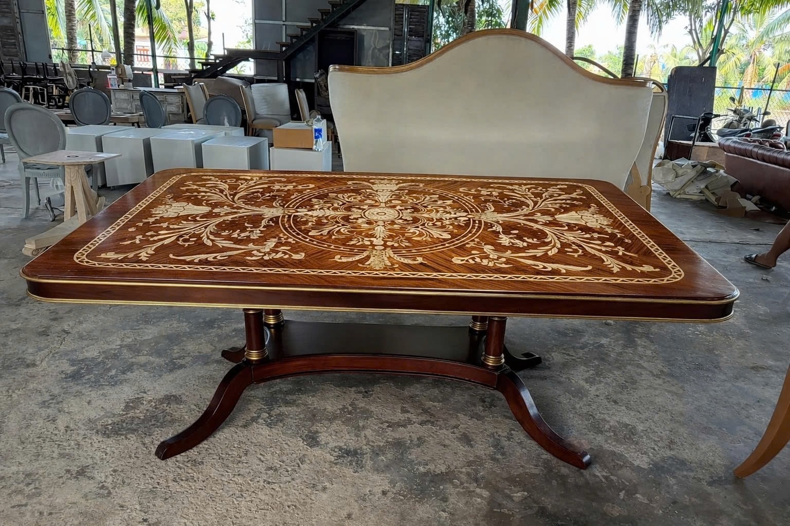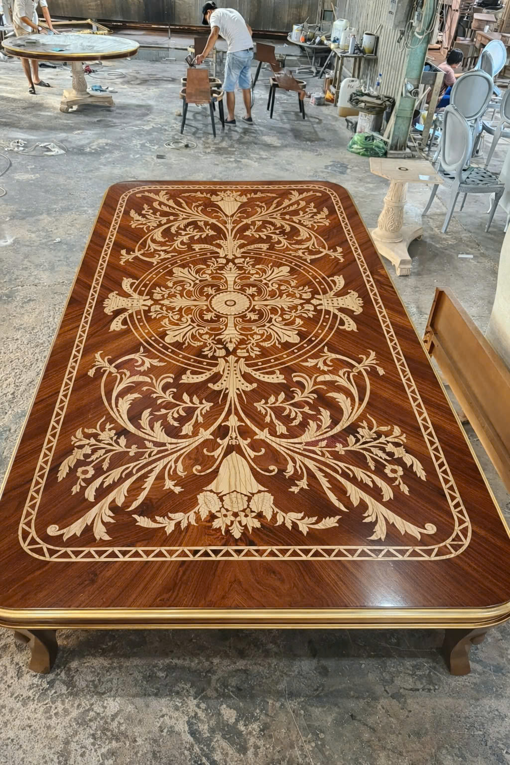 Mặt bàn được hoàn thiện kỹ lưỡng với chất liệu gỗ tự nhiên cao cấp. Bề mặt có thể được xử lý veneer hoặc cẩn hoa văn tinh tế, tạo nên vẻ đẹp sang trọng và hài hòa. Nhờ quy trình gia công cẩn thận, bàn có khả năng hạn chế cong vênh, mối mọt và giữ được độ bền theo thời gian.