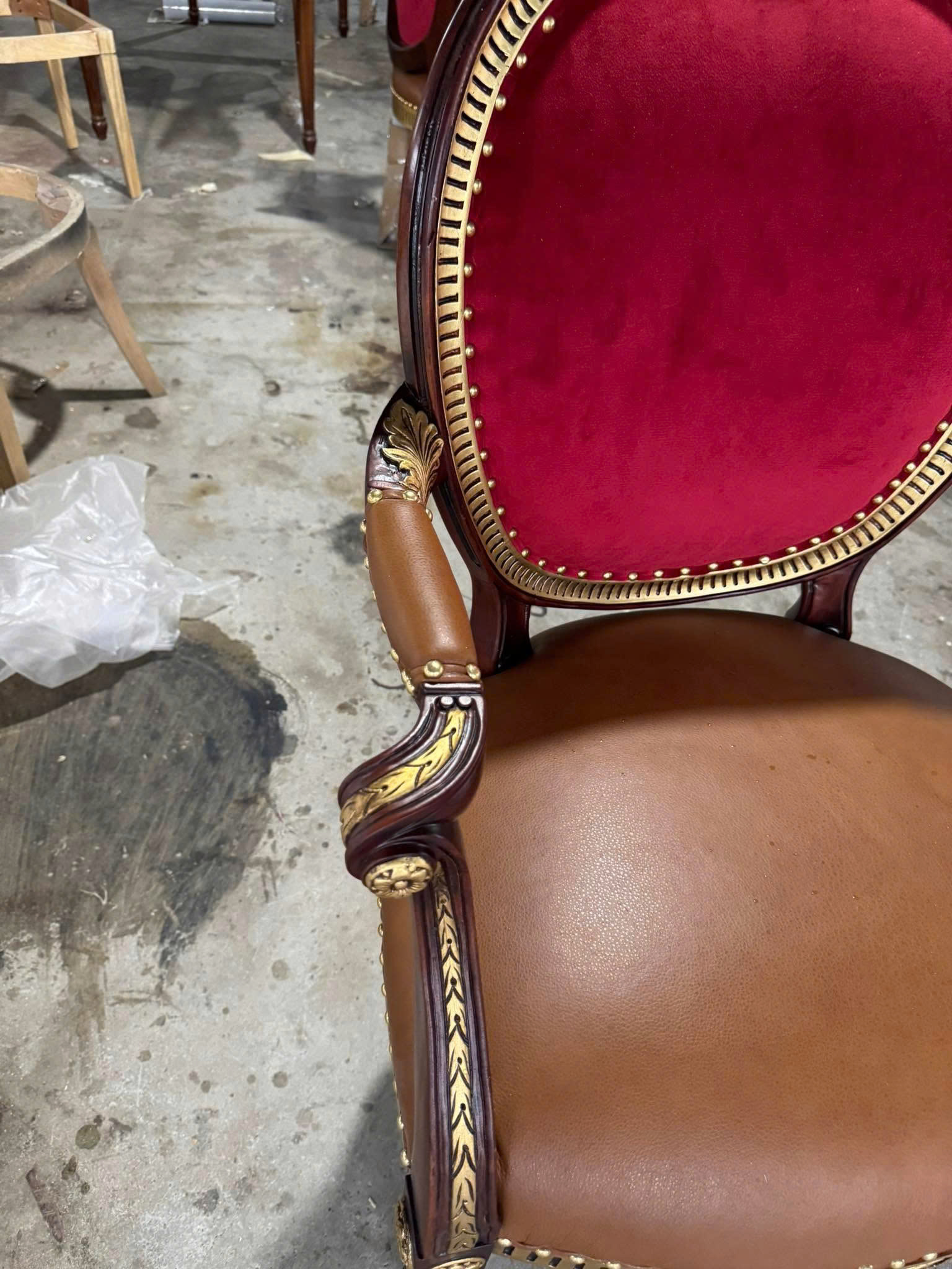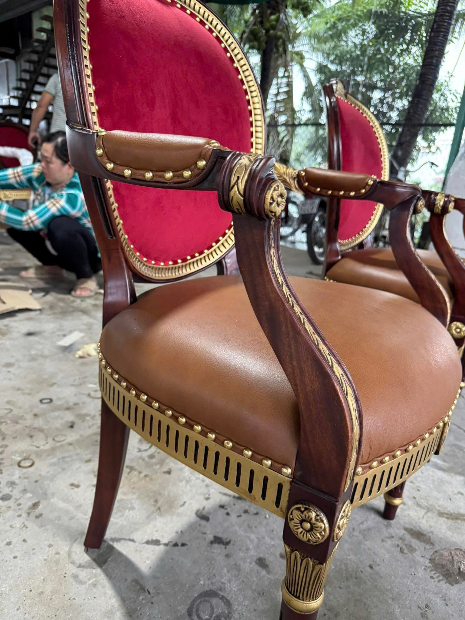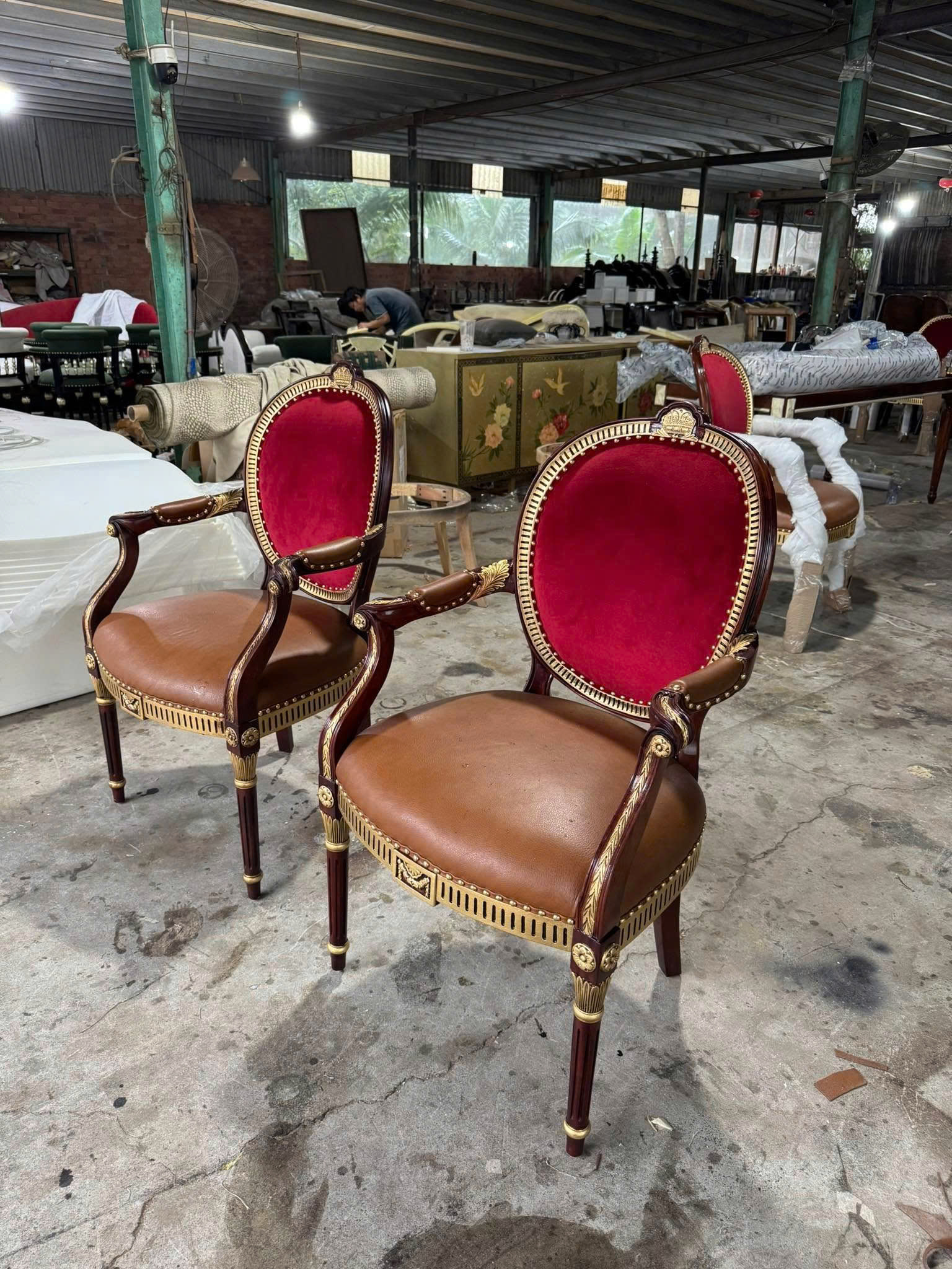 Đi kèm với bàn là 10 ghế Louis 16 mang đậm phong cách cổ điển châu Âu. Thiết kế ghế nổi bật với phần tựa lưng cao, uốn cong mềm mại, tạo cảm giác thoải mái khi ngồi. Các chi tiết chạm khắc trên khung ghế được thực hiện tỉ mỉ, góp phần tạo nên tổng thể tinh tế và đẳng cấp.