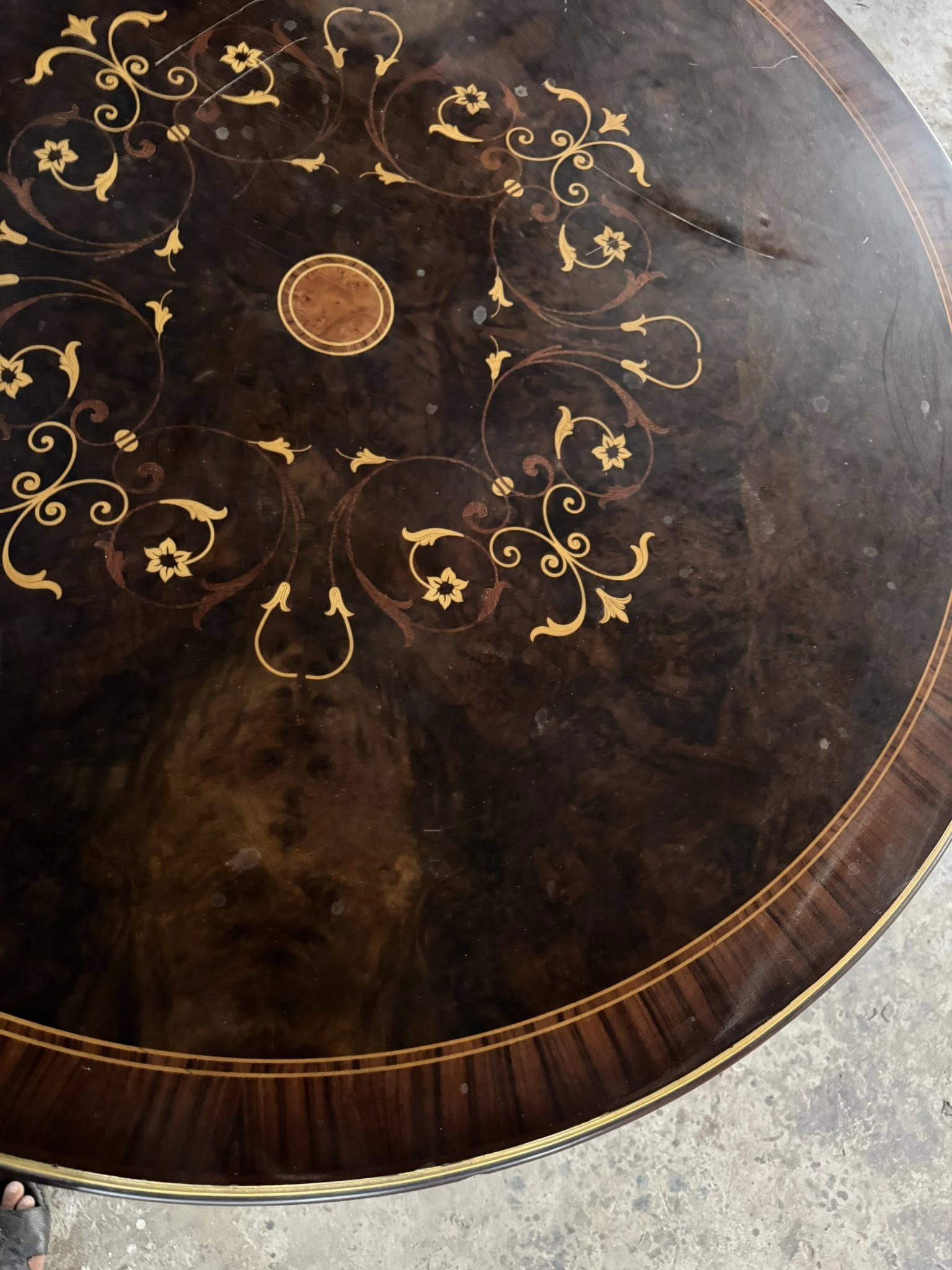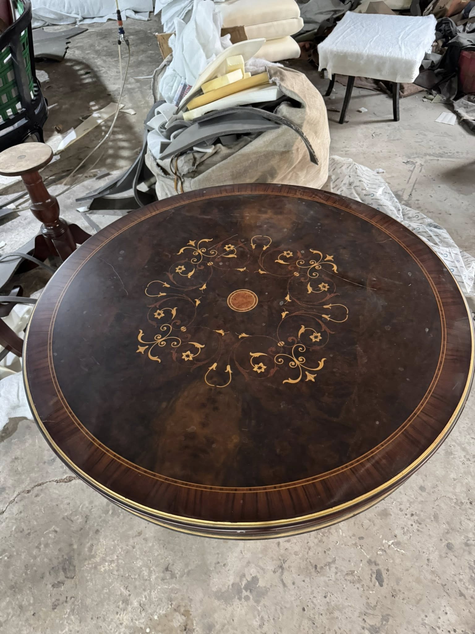 Điểm nhấn nổi bật của sản phẩm nằm ở mặt bàn được cẩn gỗ hoa văn thủ công. Các mảng gỗ được lựa chọn kỹ lưỡng, ghép nối và cẩn tỉ mỉ để tạo nên họa tiết mềm mại, cân đối và có chiều sâu. Hoa văn cẩn gỗ không chỉ làm tăng giá trị thẩm mỹ mà còn thể hiện trình độ tay nghề và sự tâm huyết của người thợ.