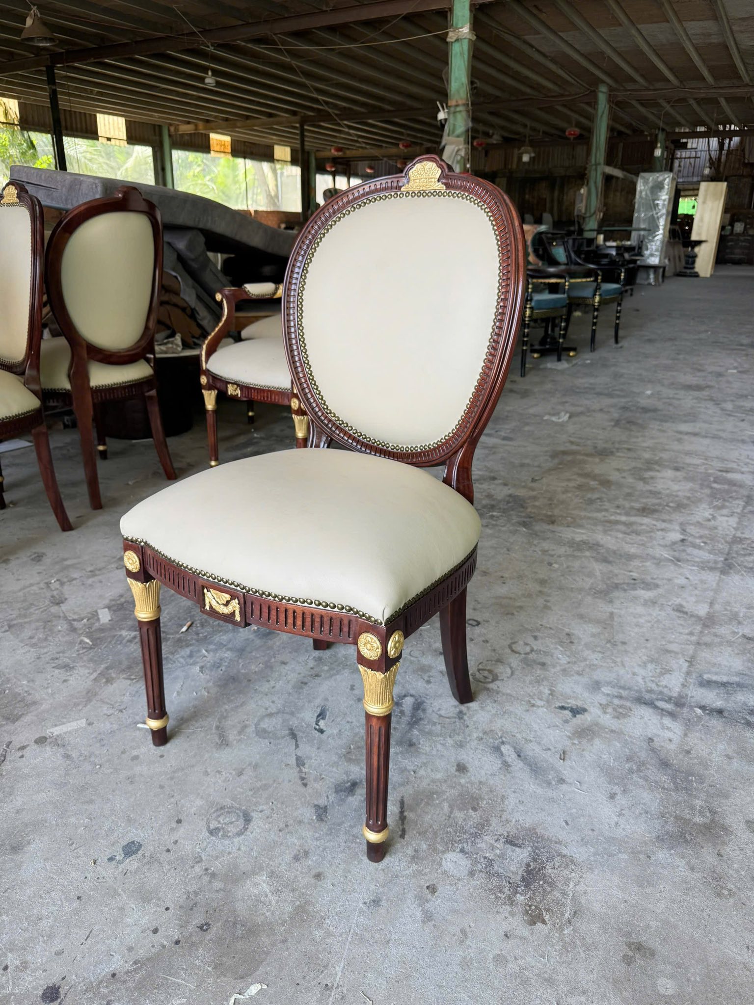 Mặt bàn ghép veneer hướng tâm (đứng ở mỗi góc độ khác nhau sẽ thấy hiệu ứng đậm nhạt của veneer khác nhau), chân bàn dát bạc champagne. Ghế lên màu walnut có một số chi tiết hoa văn dát vàng, ghế bọc da bò nhập khẩu.