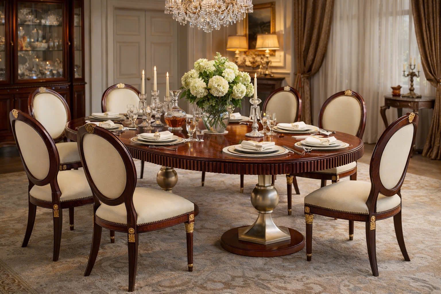 Bàn ăn veneer hướng tâm đặt trong không gian phòng ăn cao cấp