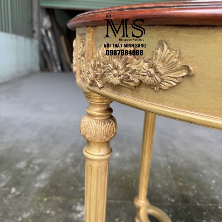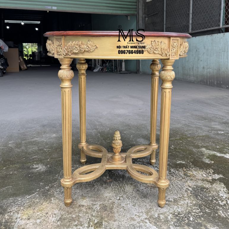 Điểm nhấn nổi bật nhất của sản phẩm chính là phần chân bàn dát vàng được hoàn thiện hoàn toàn thủ công. Lớp lá vàng thật được dát tỉ mỉ từng chi tiết, tạo nên ánh kim sang trọng nhưng không chói lóa. Khi ánh sáng phản chiếu, từng đường nét trở nên lung linh, toát lên vẻ quyền quý và tinh tế.