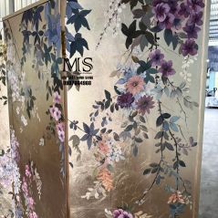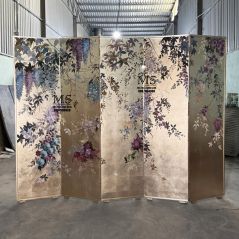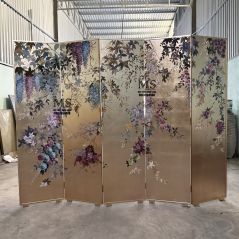 Bình phong 5 tấm vẽ hoa tử đằng nền bạc champagne