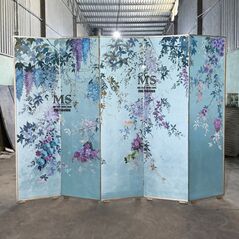 Bình phong 5 tấm vẽ hoa tử đằng trên nền dát bạc màu xanh da trời - Nội thất Minh Sang