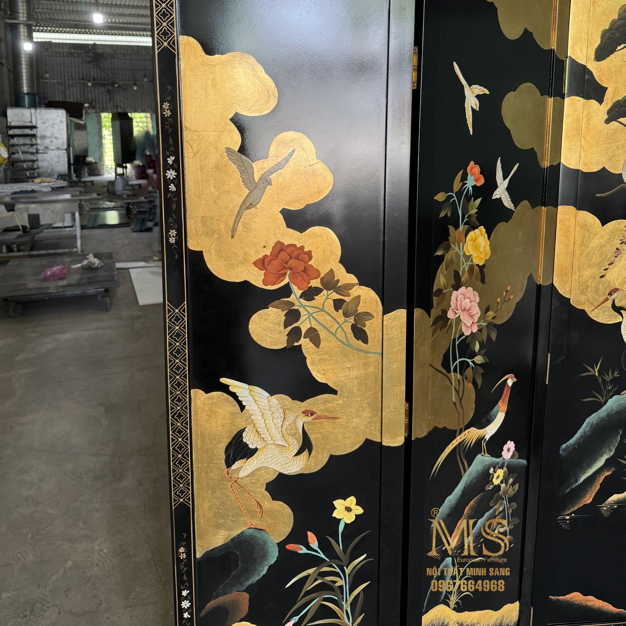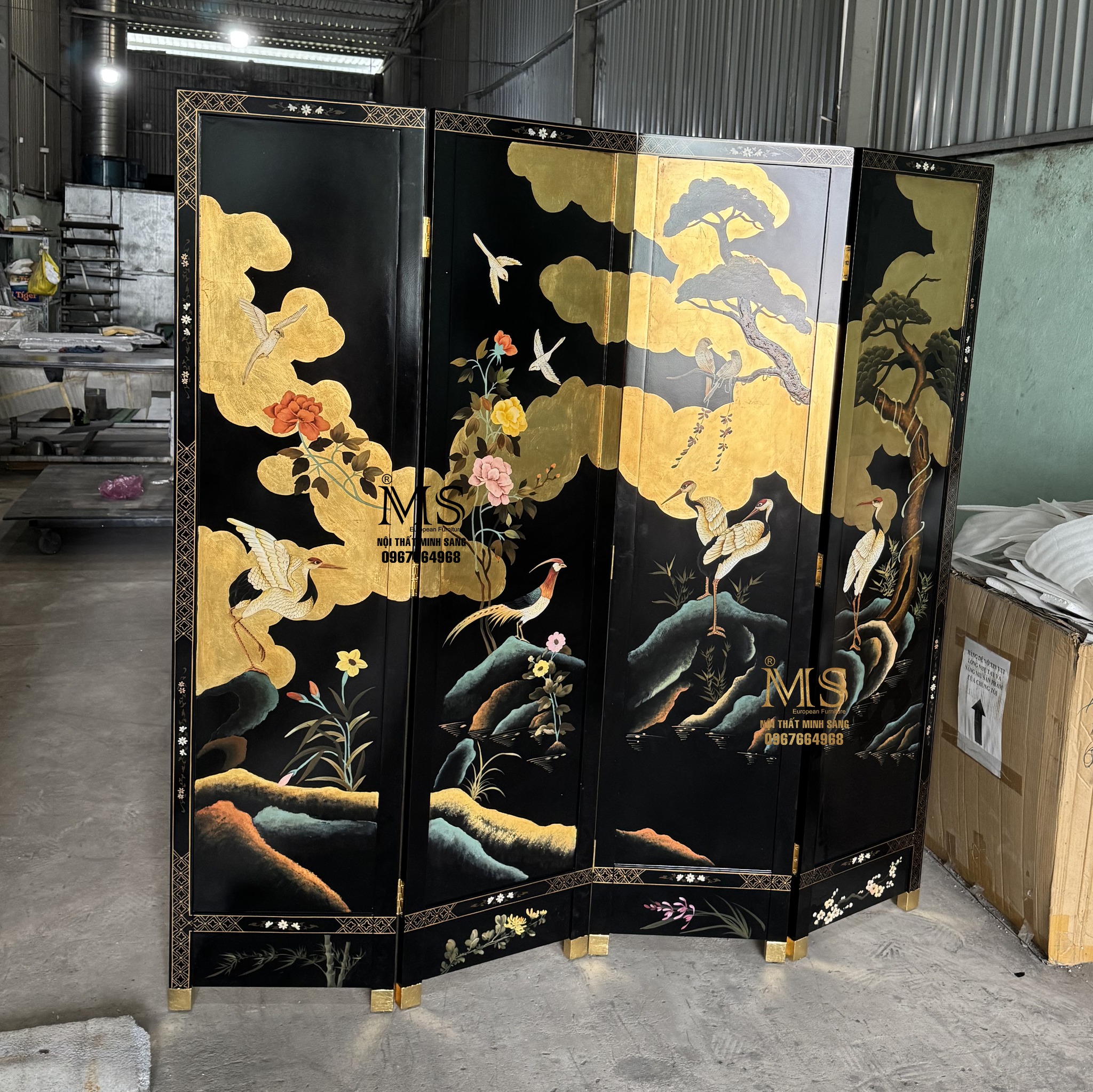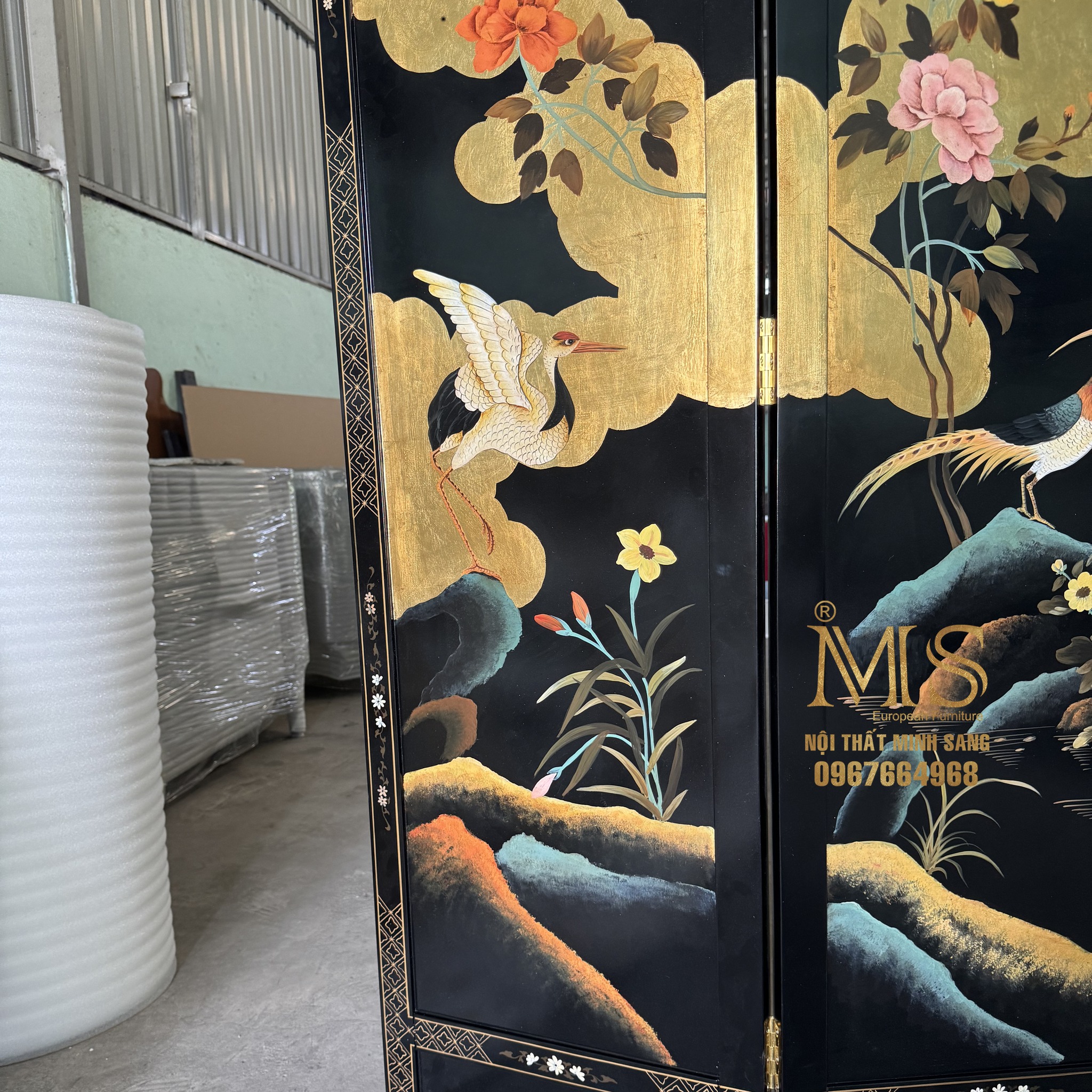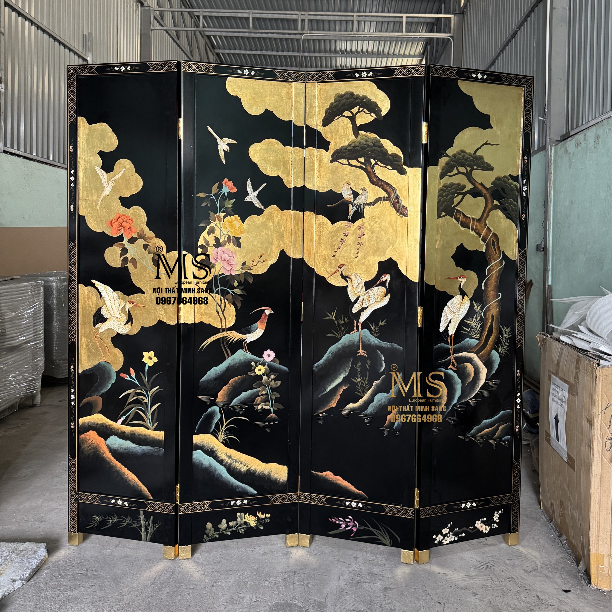Bình phong sơn đen vẽ chim hạc, cây tùng, mây dát vàng – Nội thất Minh Sang