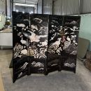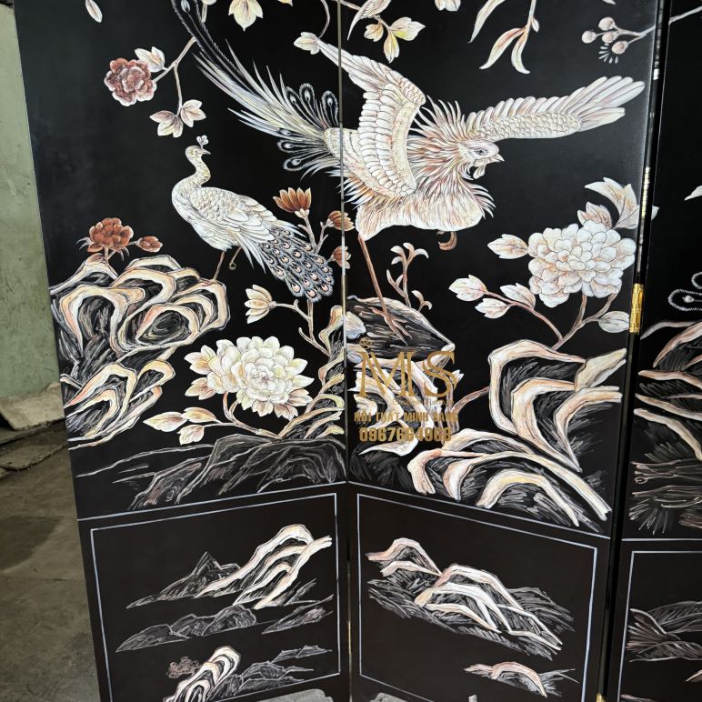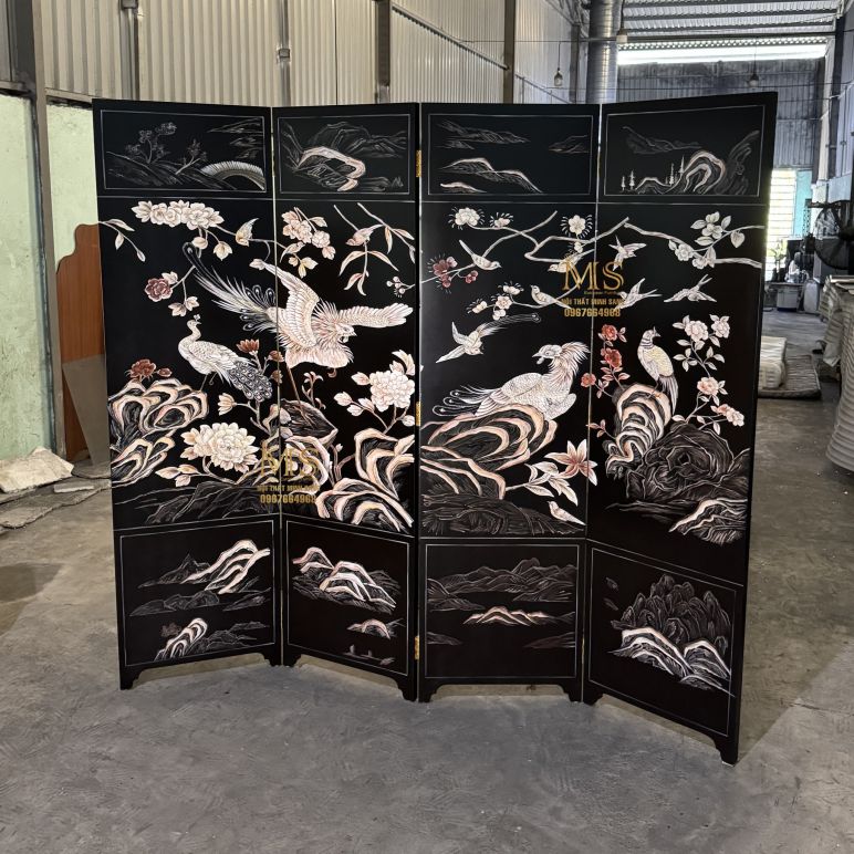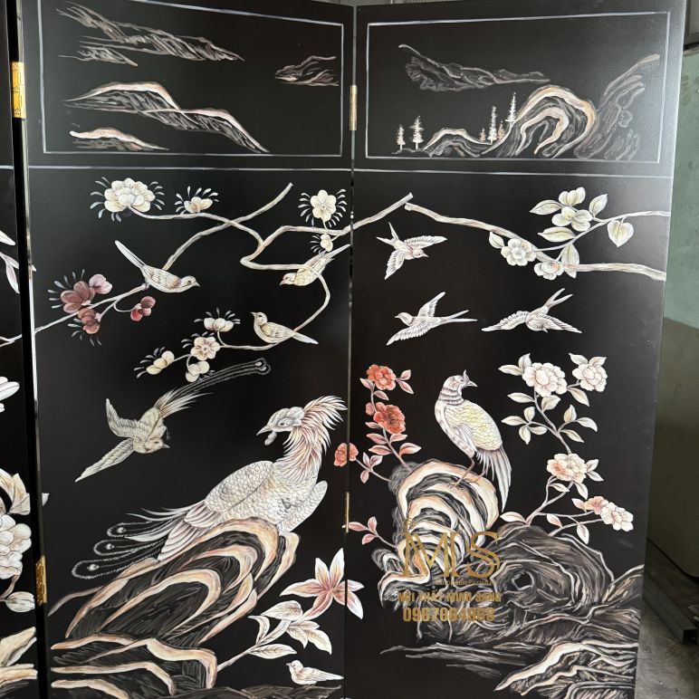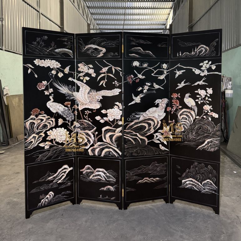 Bình phong được chế tác từ vật liệu cao cấp, khung gỗ bền chắc, bề mặt hoàn thiện tỉ mỉ bằng kỹ thuật sơn, dát hoặc in thủ công tinh tế. Các tấm bản lề nối linh hoạt, giúp dễ dàng gấp mở và thay đổi bố cục theo nhu cầu sử dụng.