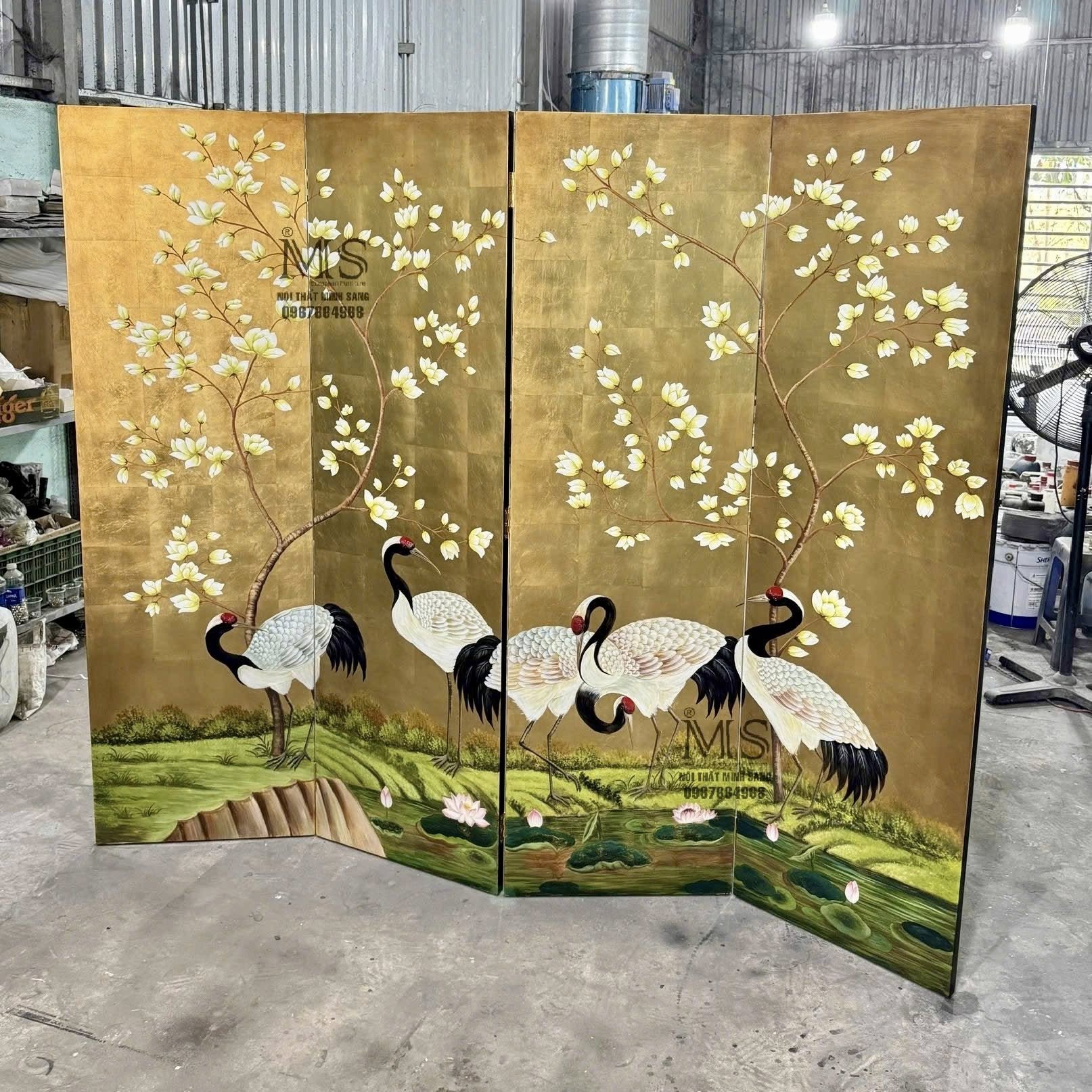 Bình phong 4 tấm vẽ sen, hạc, hoa mộc lan trên nền dát lá vàng Ý – Vẻ đẹp sang trọng và thanh cao