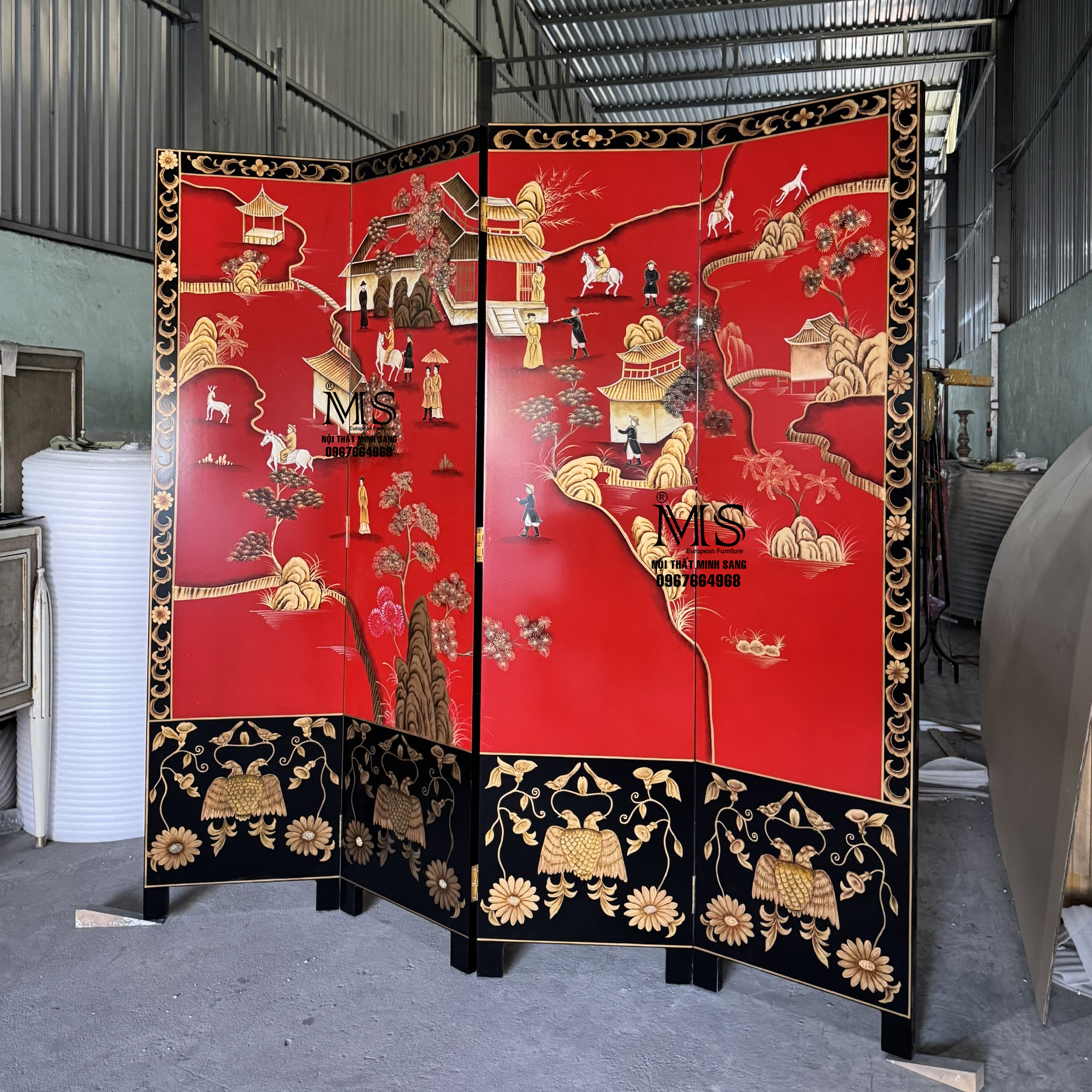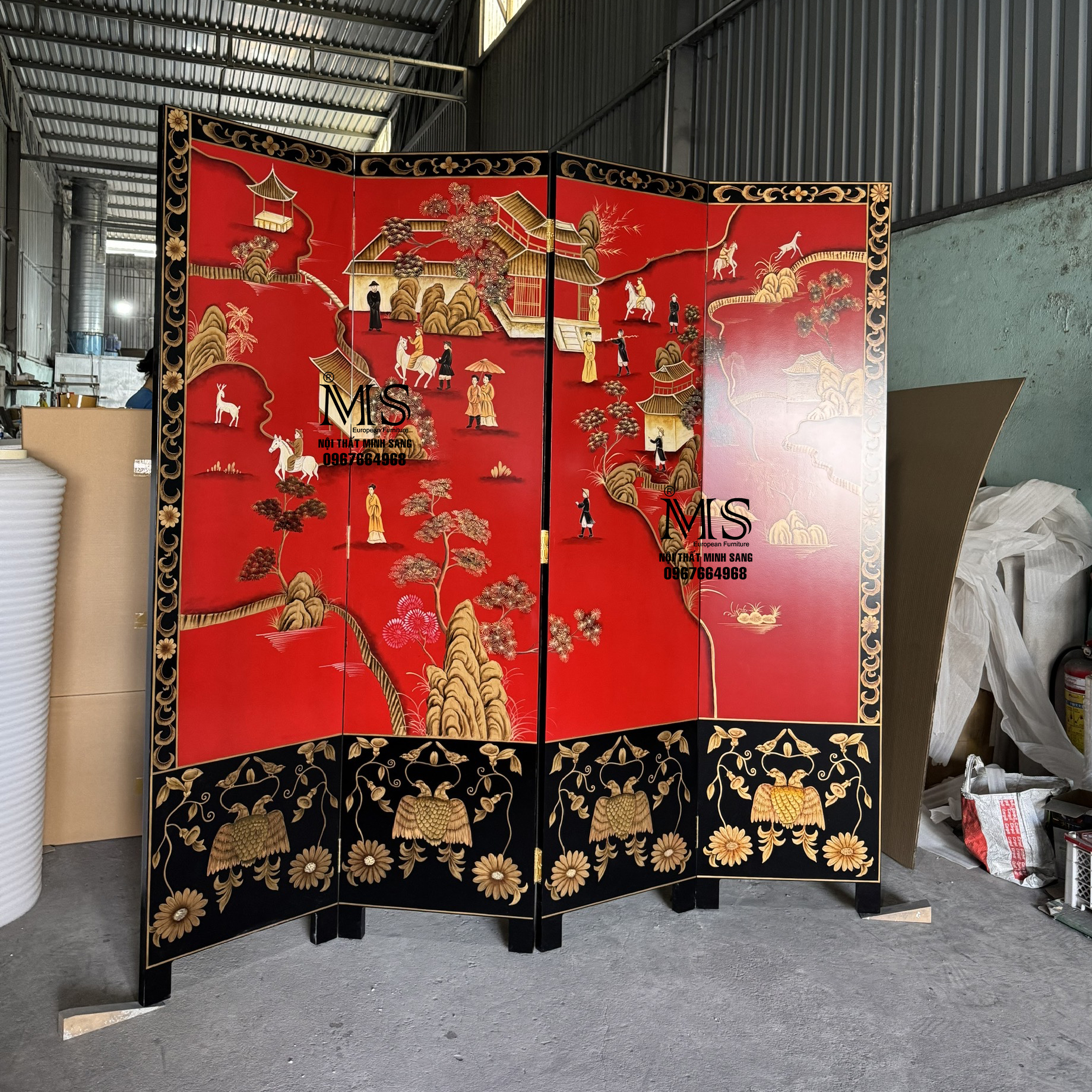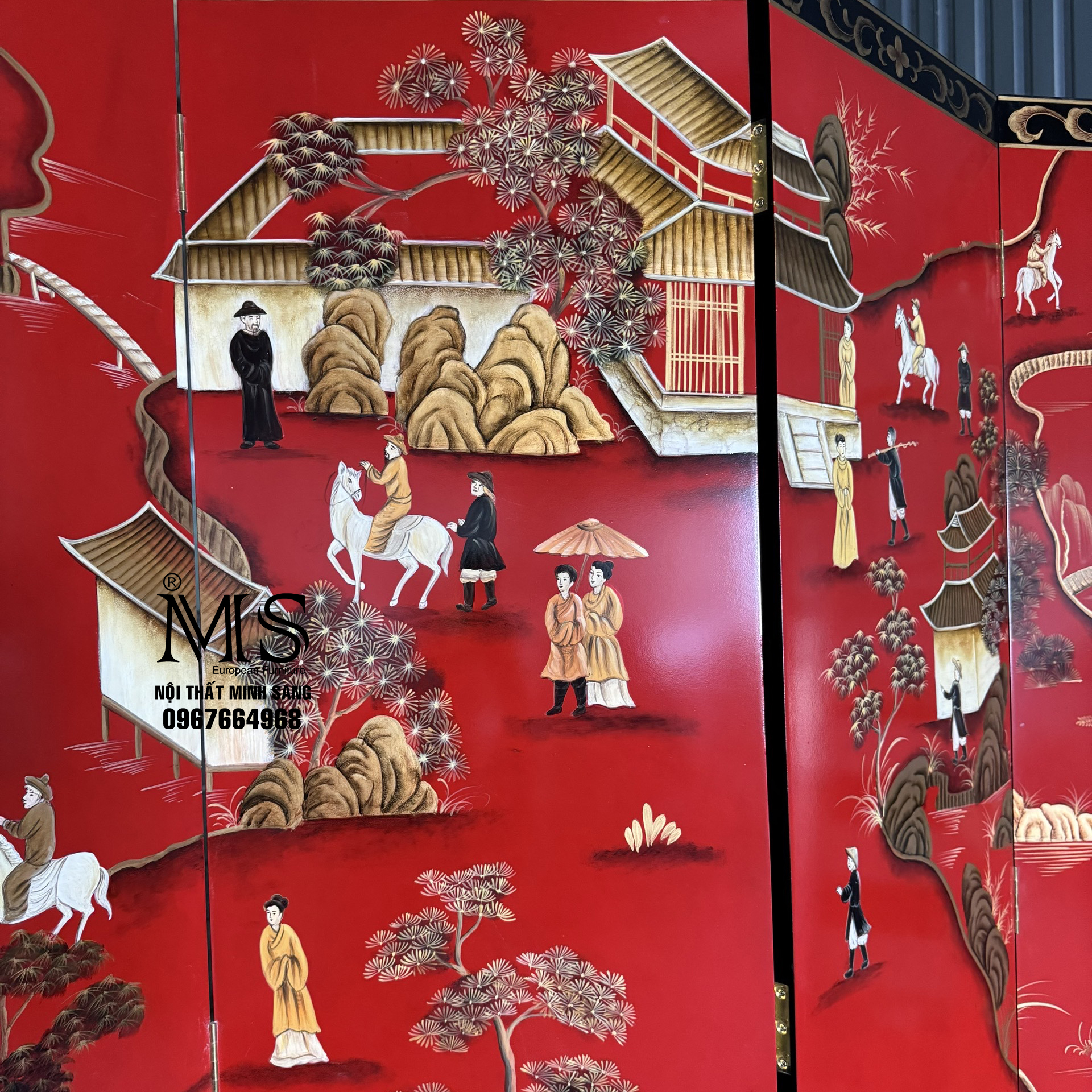 Bộ bình phong 4 tấm gây ấn tượng mạnh với nền đỏ son rực rỡ, kết hợp họa tiết phong cảnh Á Đông cổ: mái đình, núi non, cây tùng, nhân vật tao nhã được vẽ tay tinh xảo.