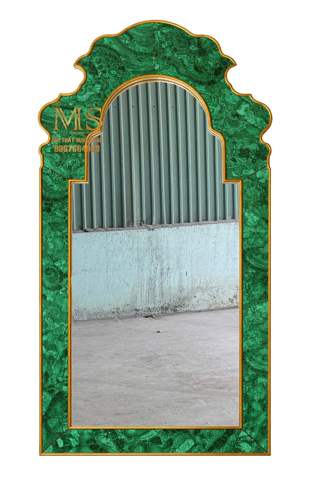 Điểm đặc biệt của mẫu khung gương này nằm ở kỹ thuật vẽ giả đá khổng tước – một dạng hoàn thiện nghệ thuật mô phỏng vân đá tự nhiên với sắc xanh đặc trưng và những đường vân uyển chuyển. Đá khổng tước (malachite) vốn nổi tiếng bởi vẻ đẹp độc đáo, và khi được tái hiện bằng tay nghề thủ công, từng chi tiết trở nên sống động, mang lại cảm giác chân thực và giàu tính thẩm mỹ.