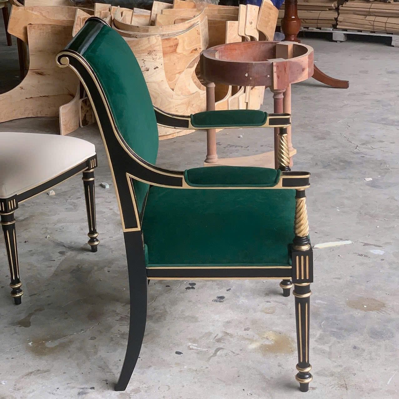 Sự kết hợp giữa tay xoắn nghệ thuật và vải nhung xanh cao cấp khiến chiếc ghế không chỉ là vật dụng sử dụng hàng ngày mà còn là một món đồ trang trí tinh tế. Khi đặt xung quanh bàn ăn, ghế góp phần tạo nên không gian ấm cúng, gần gũi, giúp mỗi bữa ăn trở nên trọn vẹn hơn.
