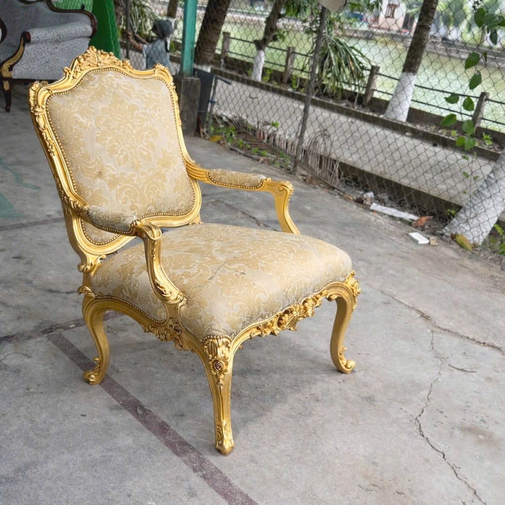 Điểm nhấn đặc biệt của sản phẩm chính là lớp dát vàng được thực hiện thủ công trên khung ghế. Lớp vàng ánh nhẹ giúp làm nổi bật các chi tiết chạm khắc tinh xảo, đồng thời tạo nên vẻ đẹp sang trọng và đẳng cấp. Từng chi tiết nhỏ đều được hoàn thiện tỉ mỉ, mang lại giá trị thẩm mỹ cao cho sản phẩm.