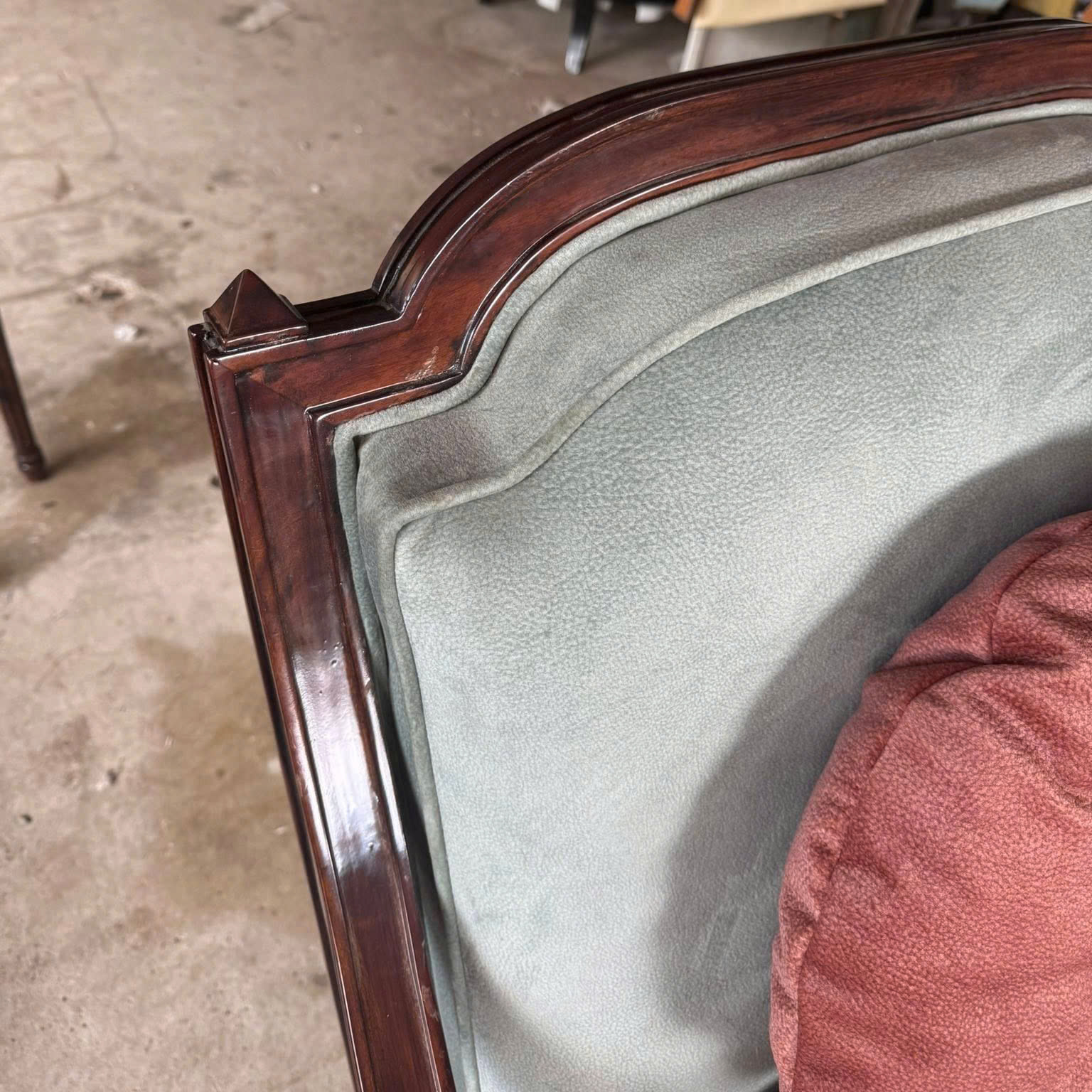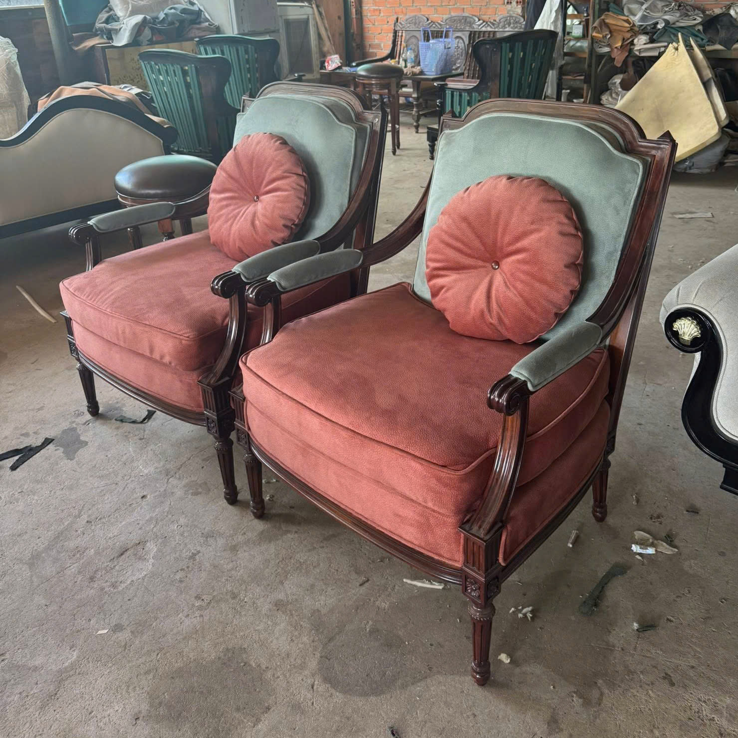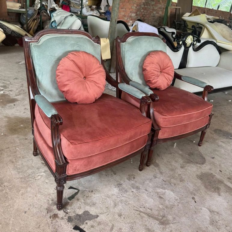 Với mẫu ghế đơn cổ điển Châu Âu bọc nỉ nhung phối hai màu, sự kết hợp giữa đỏ gạch và xanh ngọc nhạt mang lại hiệu ứng tương phản nhẹ nhàng, vừa cổ điển vừa hiện đại.