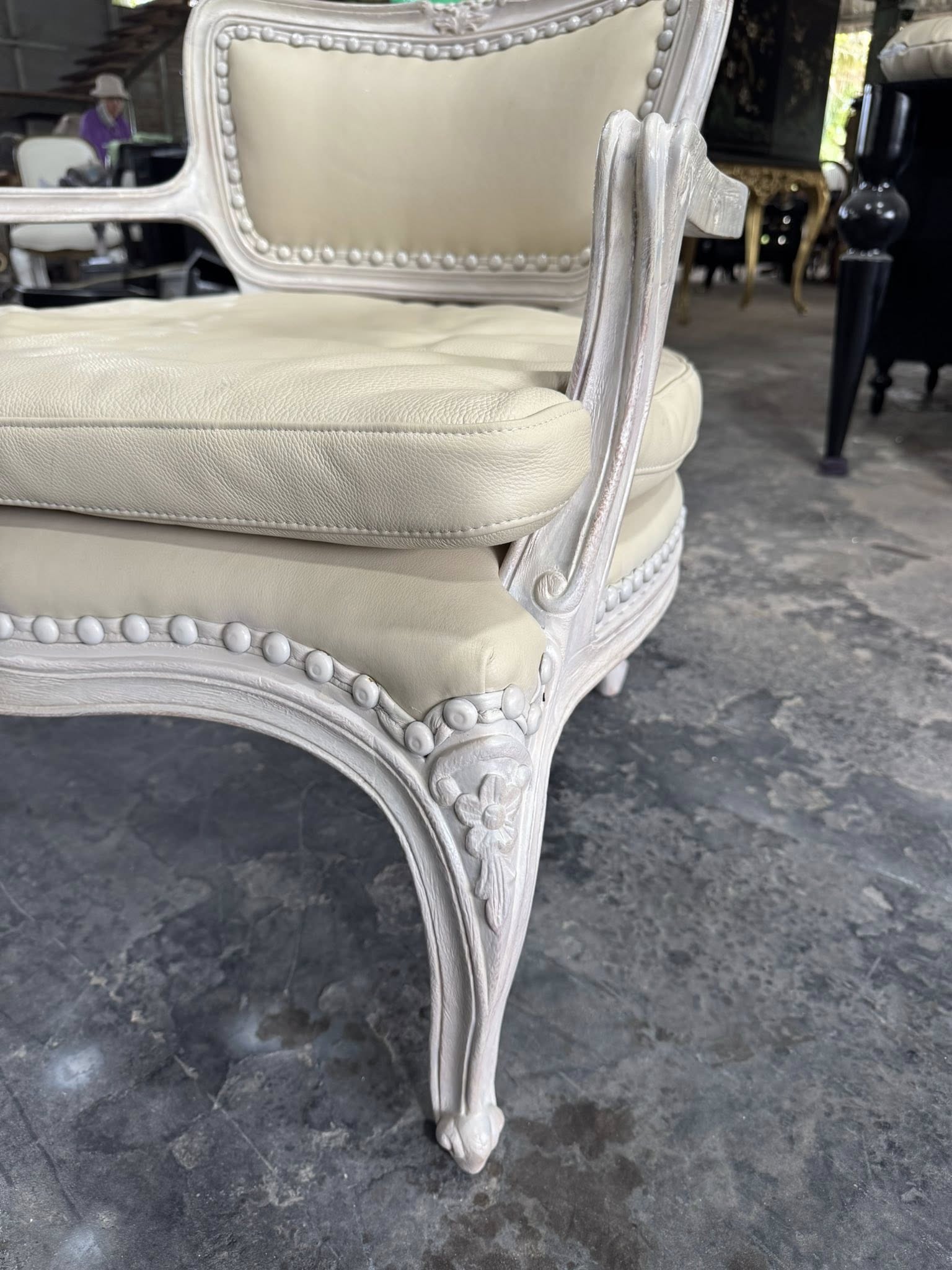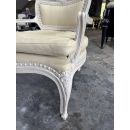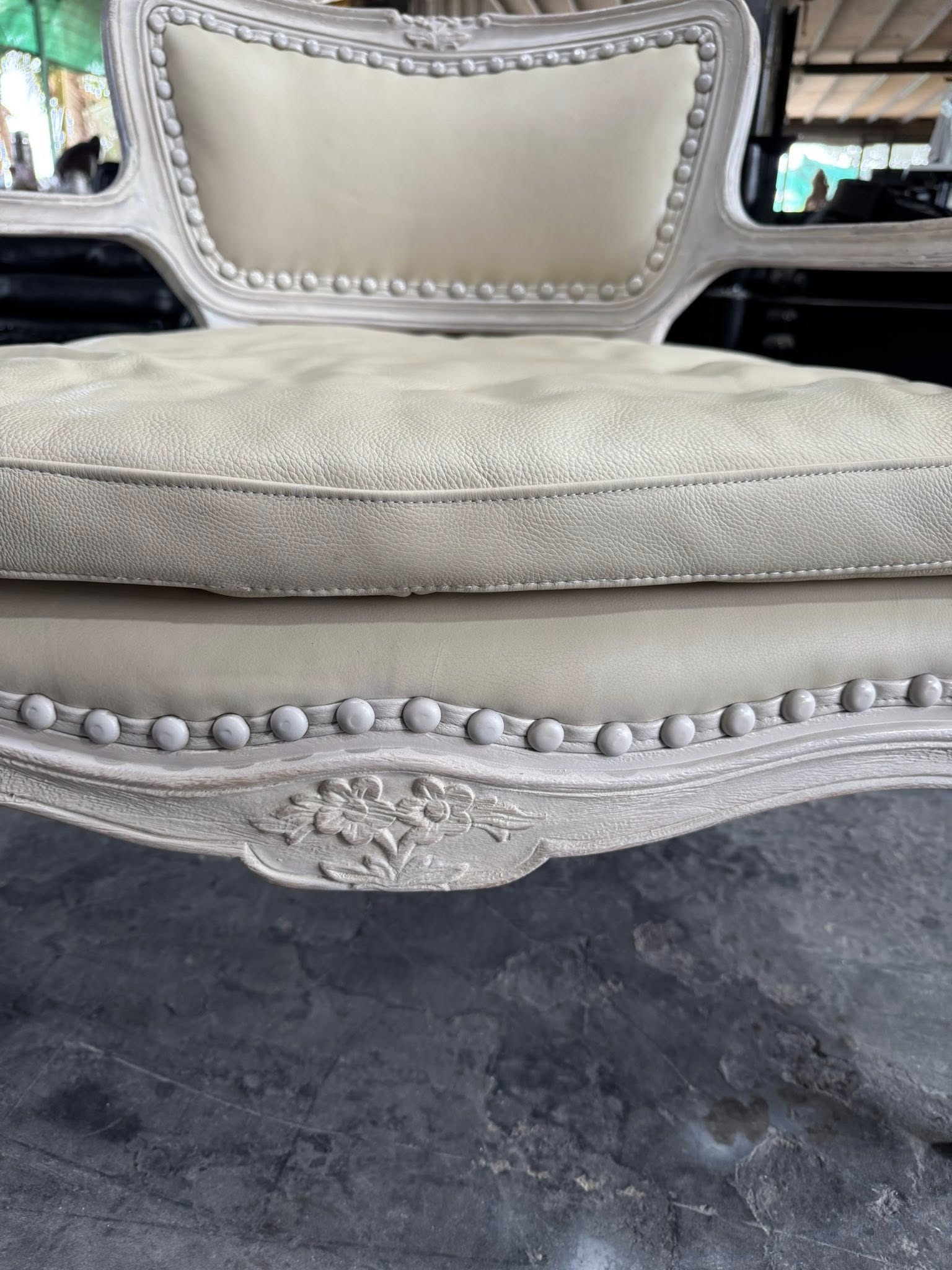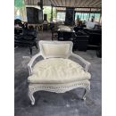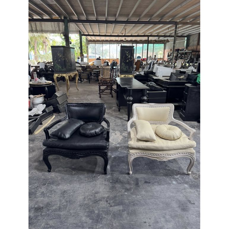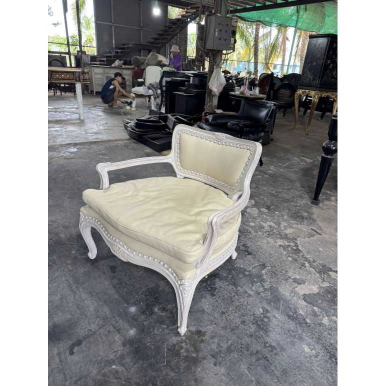 Khung ghế được sơn trắng cao cấp, vừa bảo vệ khung ghế khỏi trầy xước, vừa làm nổi bật các chi tiết chạm trổ và đường nét thiết kế. Lớp sơn trắng mang lại vẻ đẹp thanh lịch, hiện đại và hài hòa, dễ dàng phối hợp với các món nội thất khác như bàn, tủ hay bàn trà.