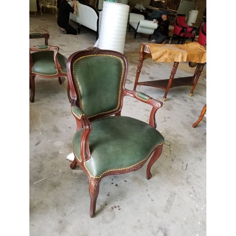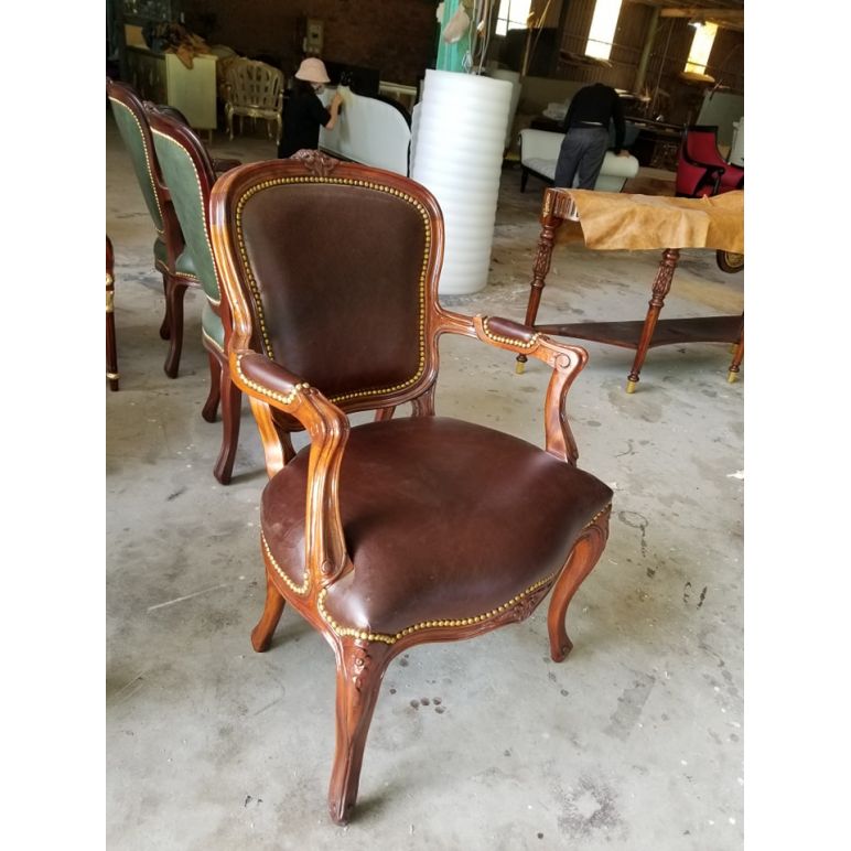 Ghế louis 15 dùng gỗ mahogany, bọc da bò và đóng đinh đồng.