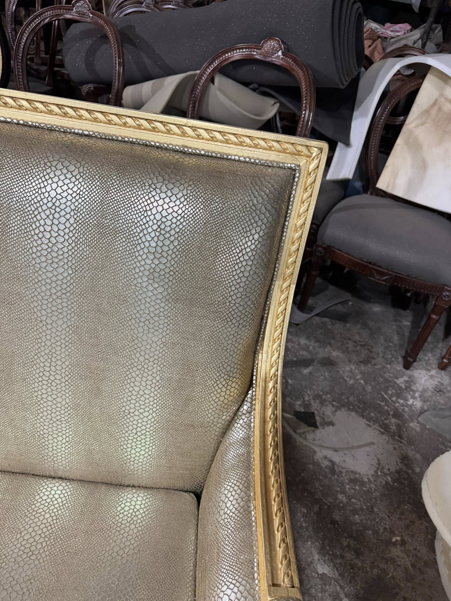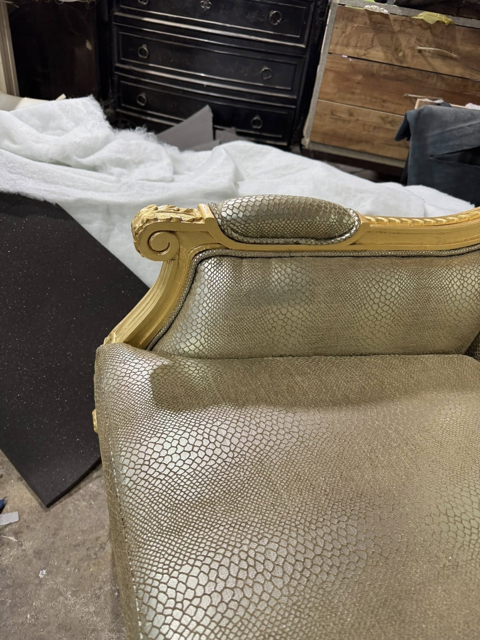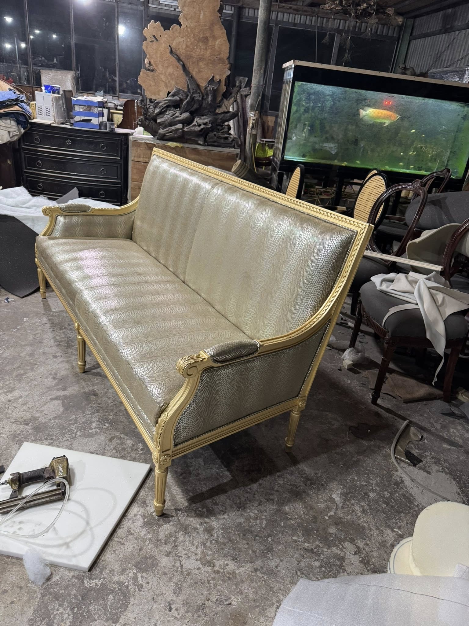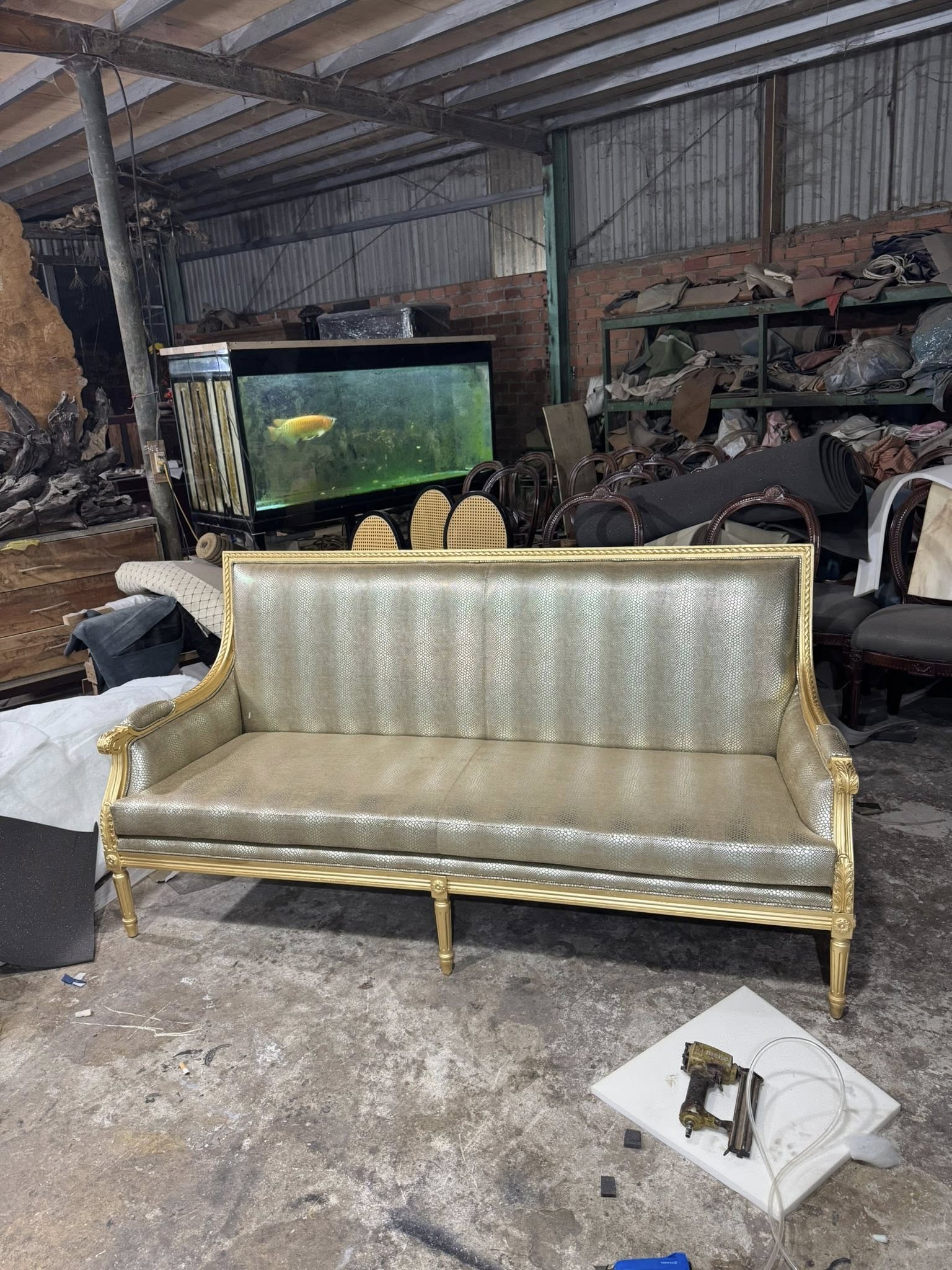 Điểm gây ấn tượng đầu tiên của chiếc sofa nằm ở phần khung được dát vàng thủ công. Lớp vàng ánh kim được xử lý khéo léo, vừa đủ để tạo nên vẻ sang trọng, quyền quý nhưng không quá phô trương. Từng chi tiết uốn lượn, đường cong mềm mại trên khung sofa thể hiện rõ tay nghề cao của người thợ, mang đến cảm giác cổ điển pha lẫn nét đương đại tinh tế.