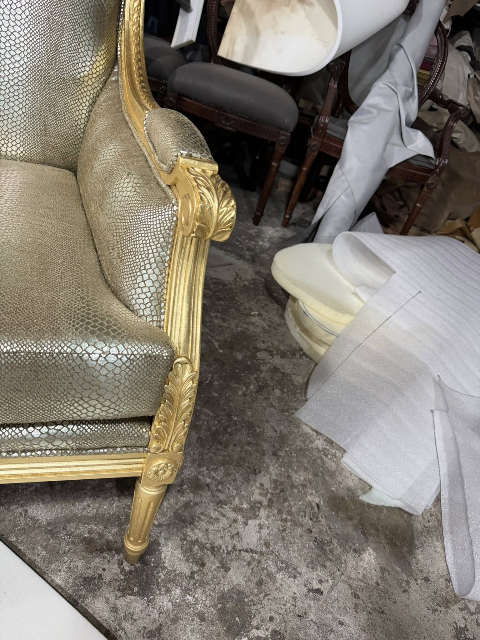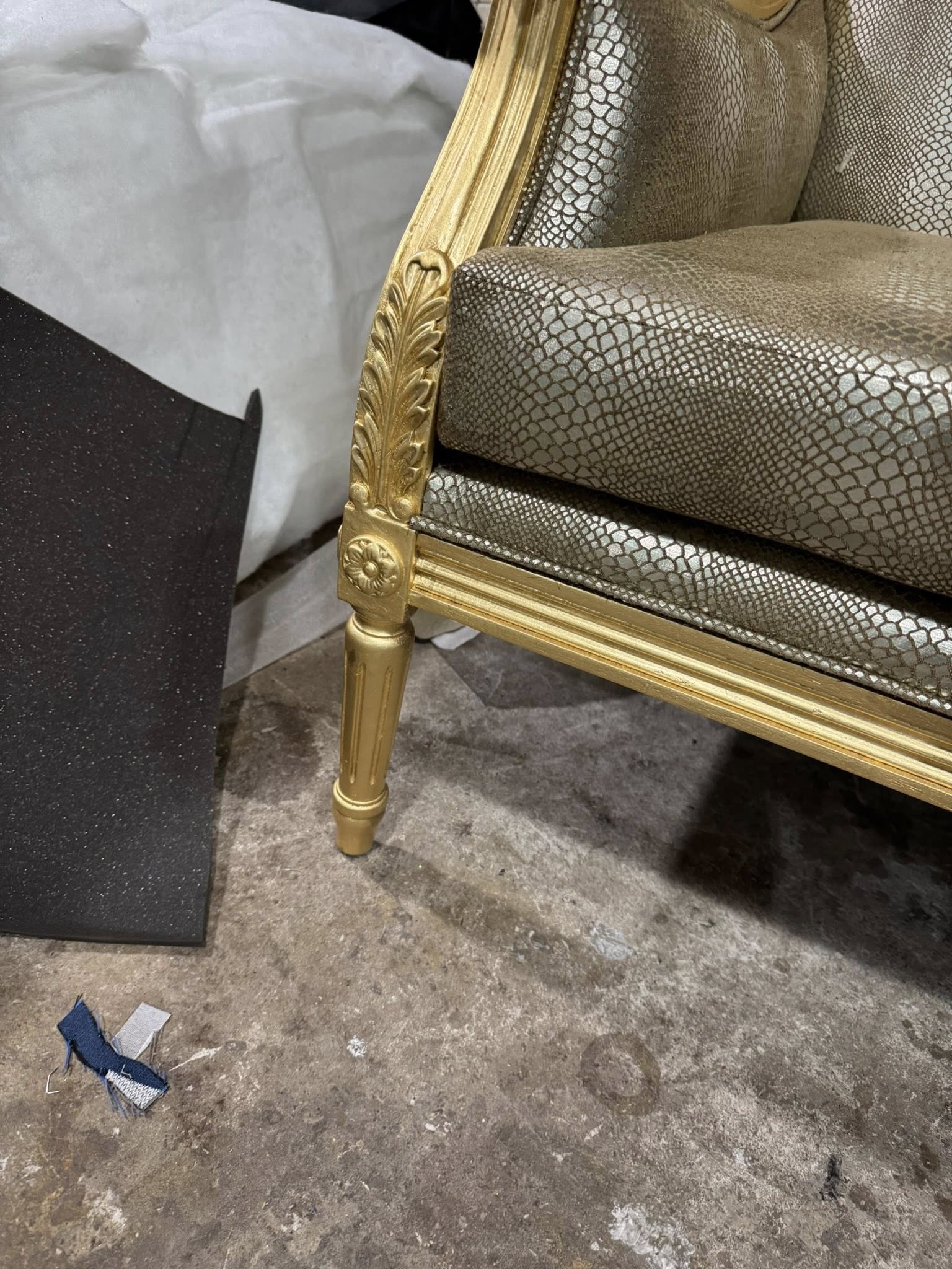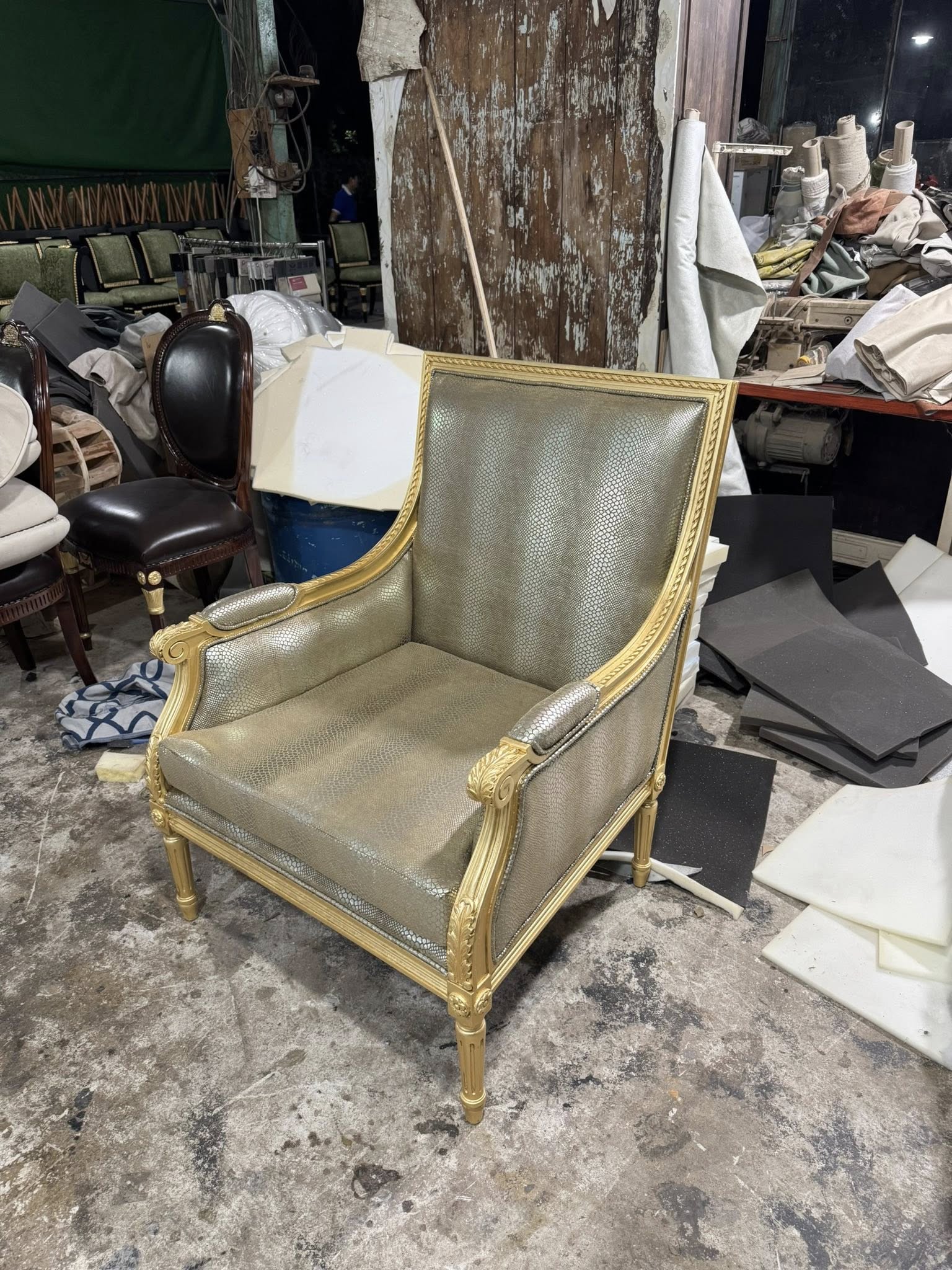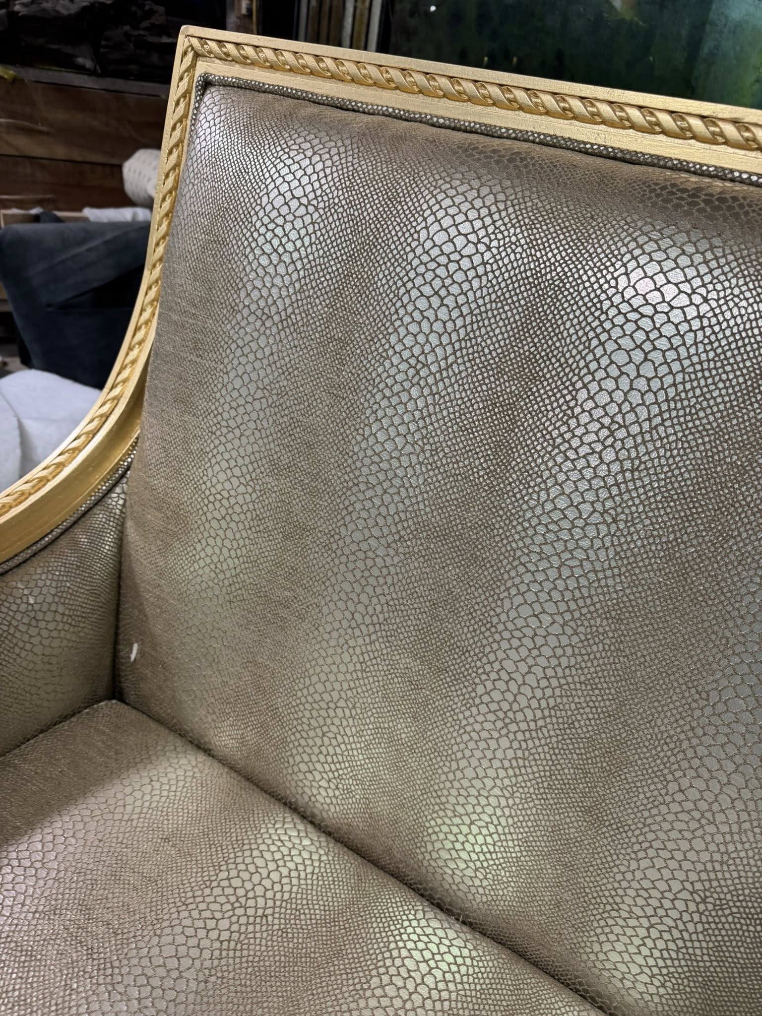 Điểm gây ấn tượng đầu tiên của chiếc sofa nằm ở phần khung được dát vàng thủ công. Lớp vàng ánh kim được xử lý khéo léo, vừa đủ để tạo nên vẻ sang trọng, quyền quý nhưng không quá phô trương. Từng chi tiết uốn lượn, đường cong mềm mại trên khung sofa thể hiện rõ tay nghề cao của người thợ, mang đến cảm giác cổ điển pha lẫn nét đương đại tinh tế.