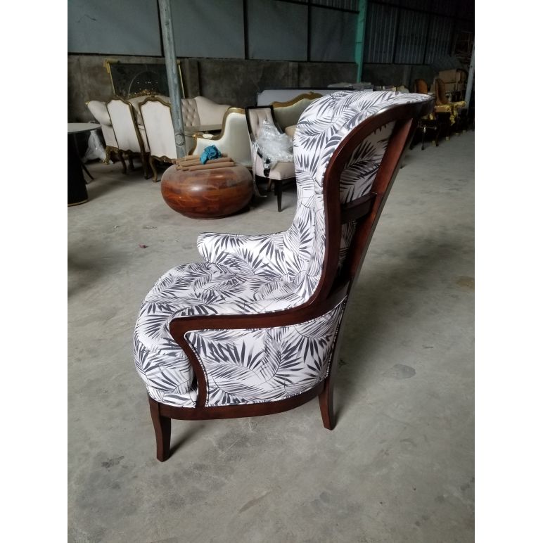 Ghế sofa đơn có tựa lưng cao dùng gỗ beech sơn màu nâu đen toàn bộ. Ghế bọc vải trắng in cành lá màu xanh đen.