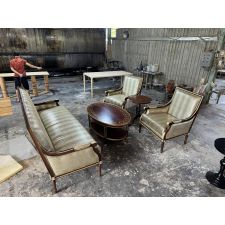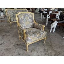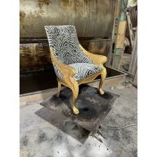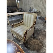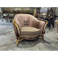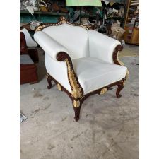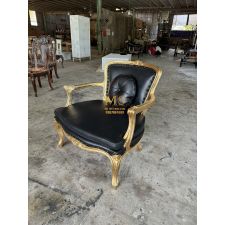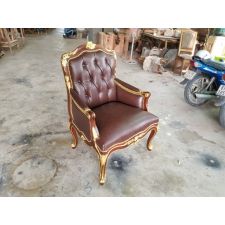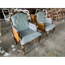 Ghế dùng gỗ beech, tựa lưng chạm trổ, nhiều chi tiết hoa văn dát vàng. Mê ngồi bọc vải nhung xanh hoặc màu vải theo yêu cầu của khách hàng.