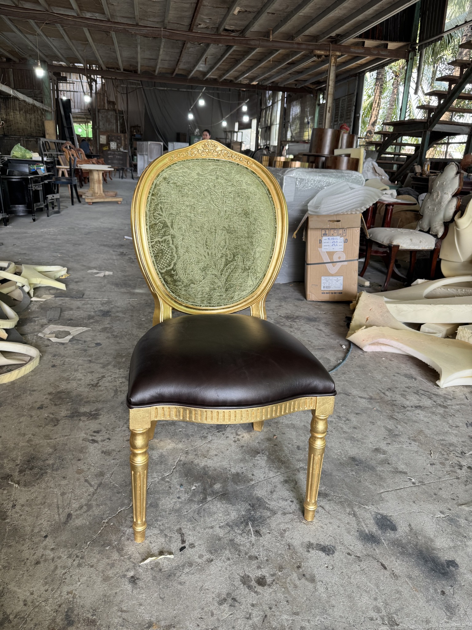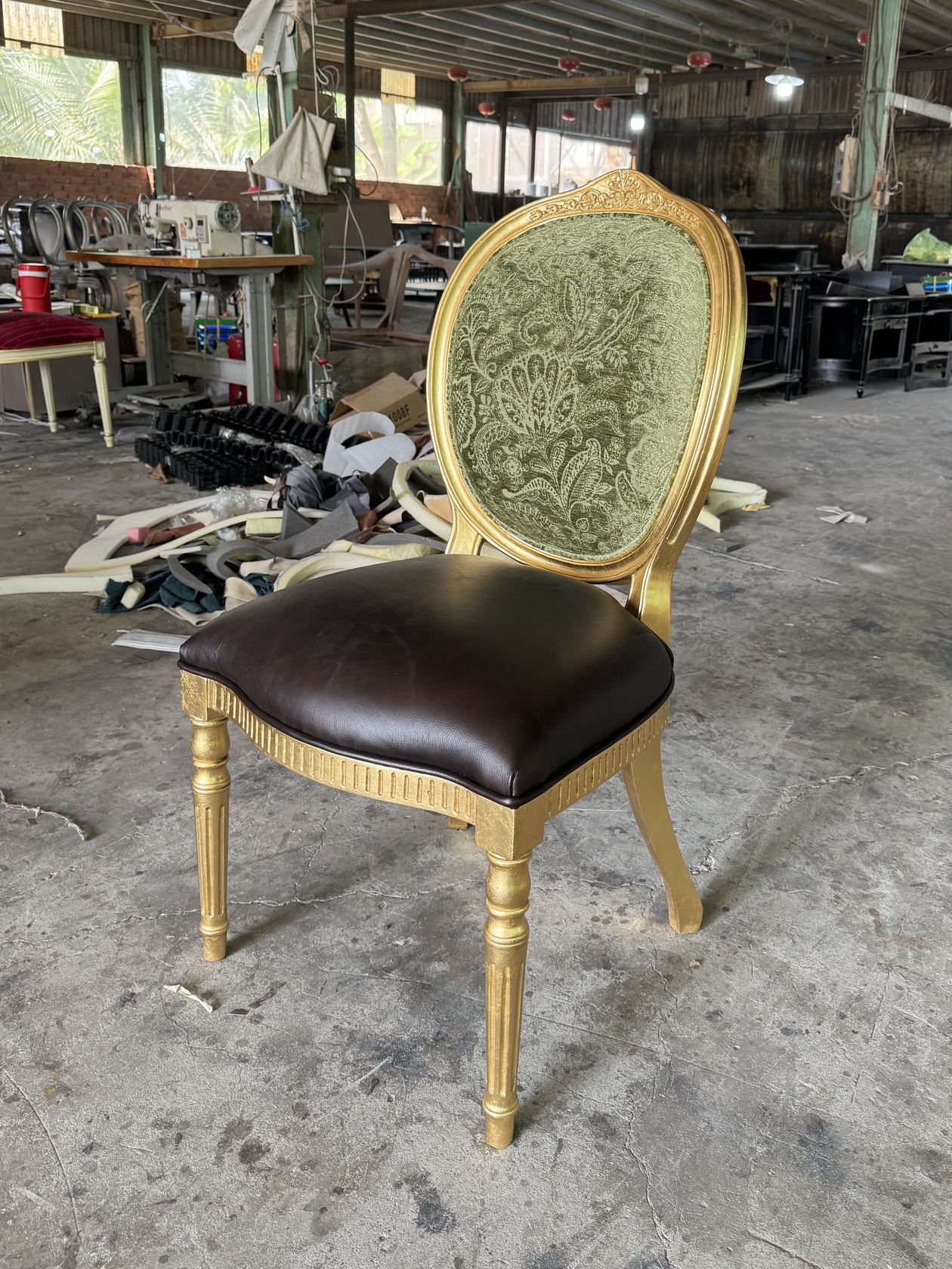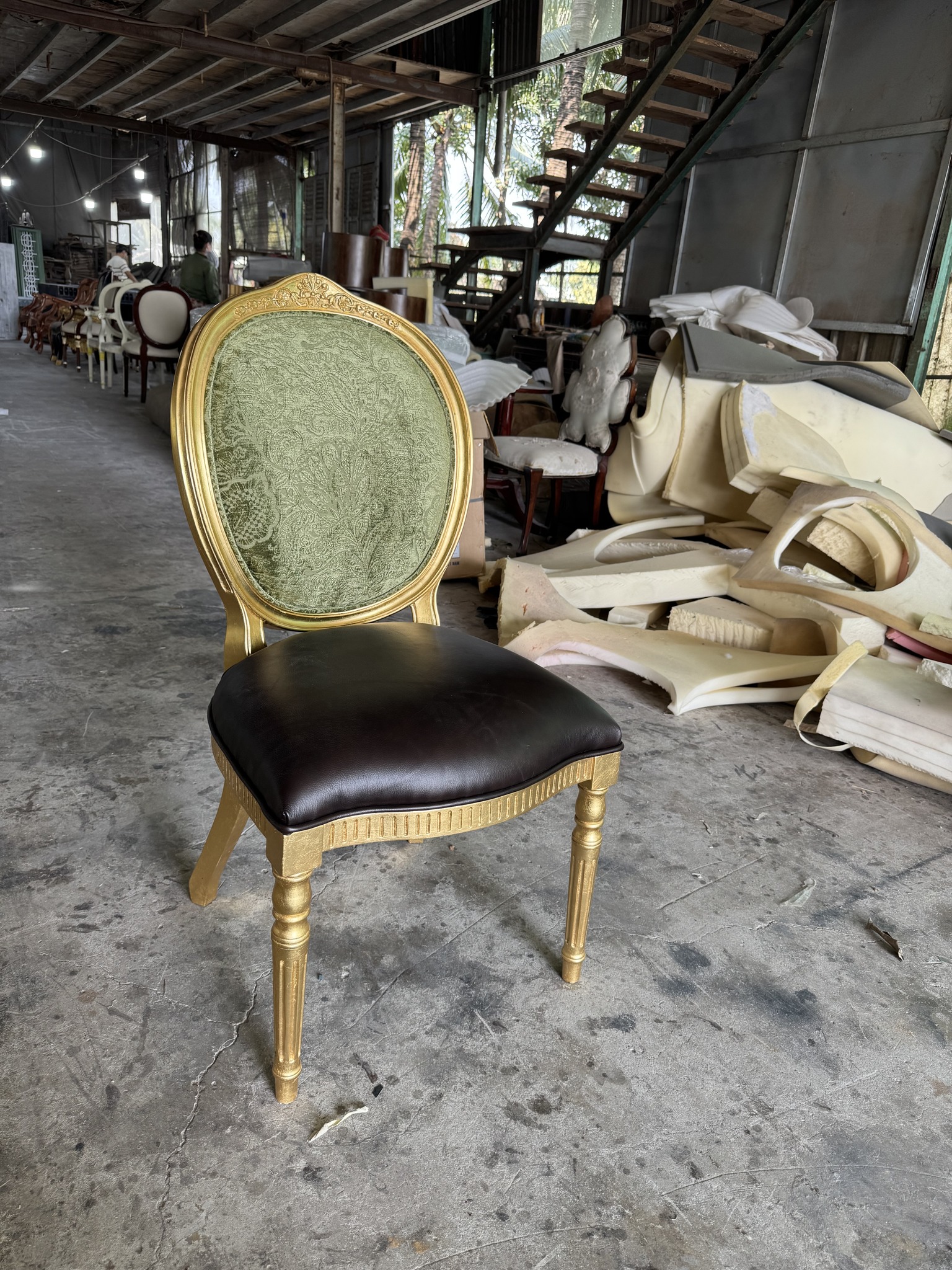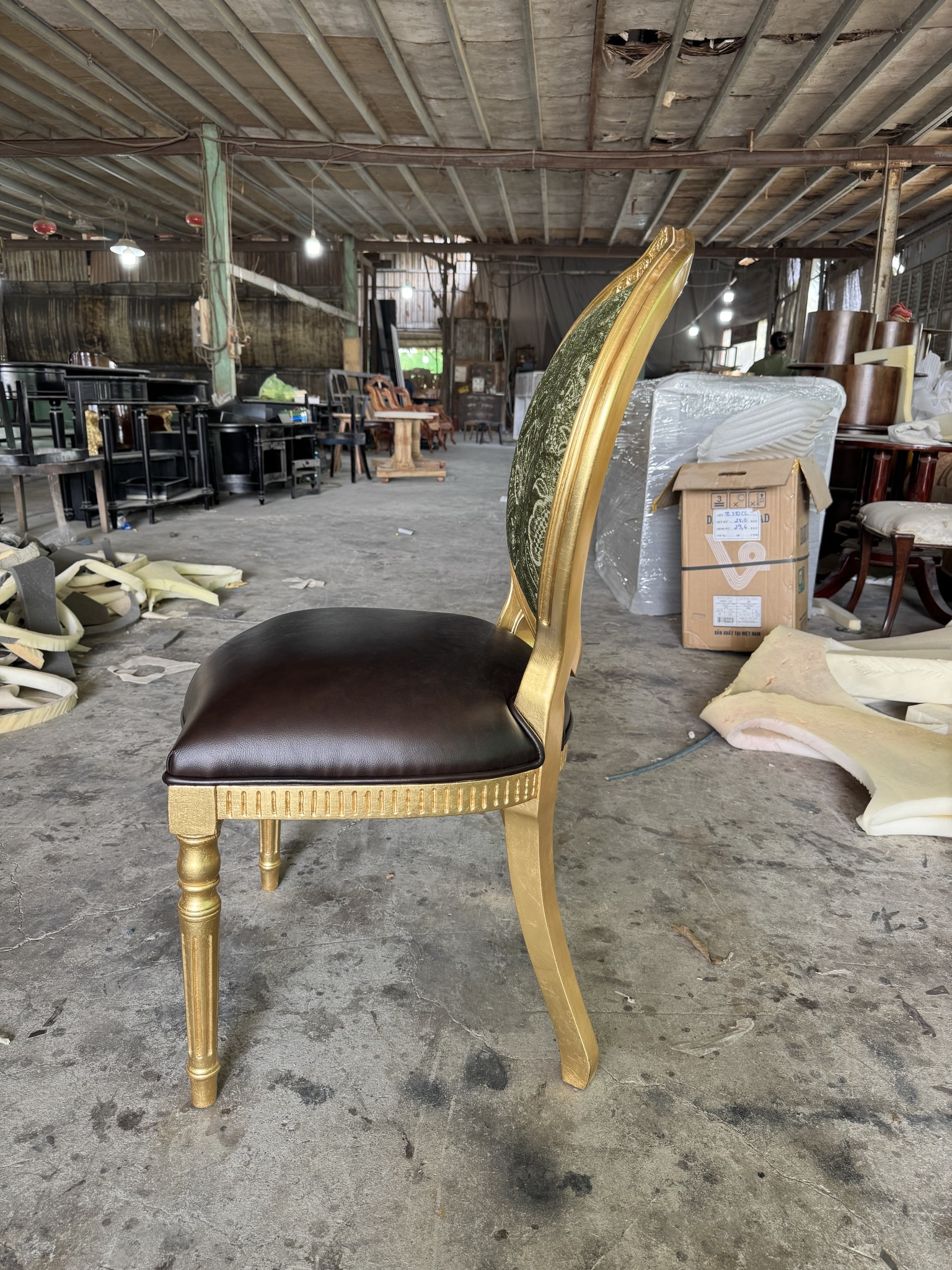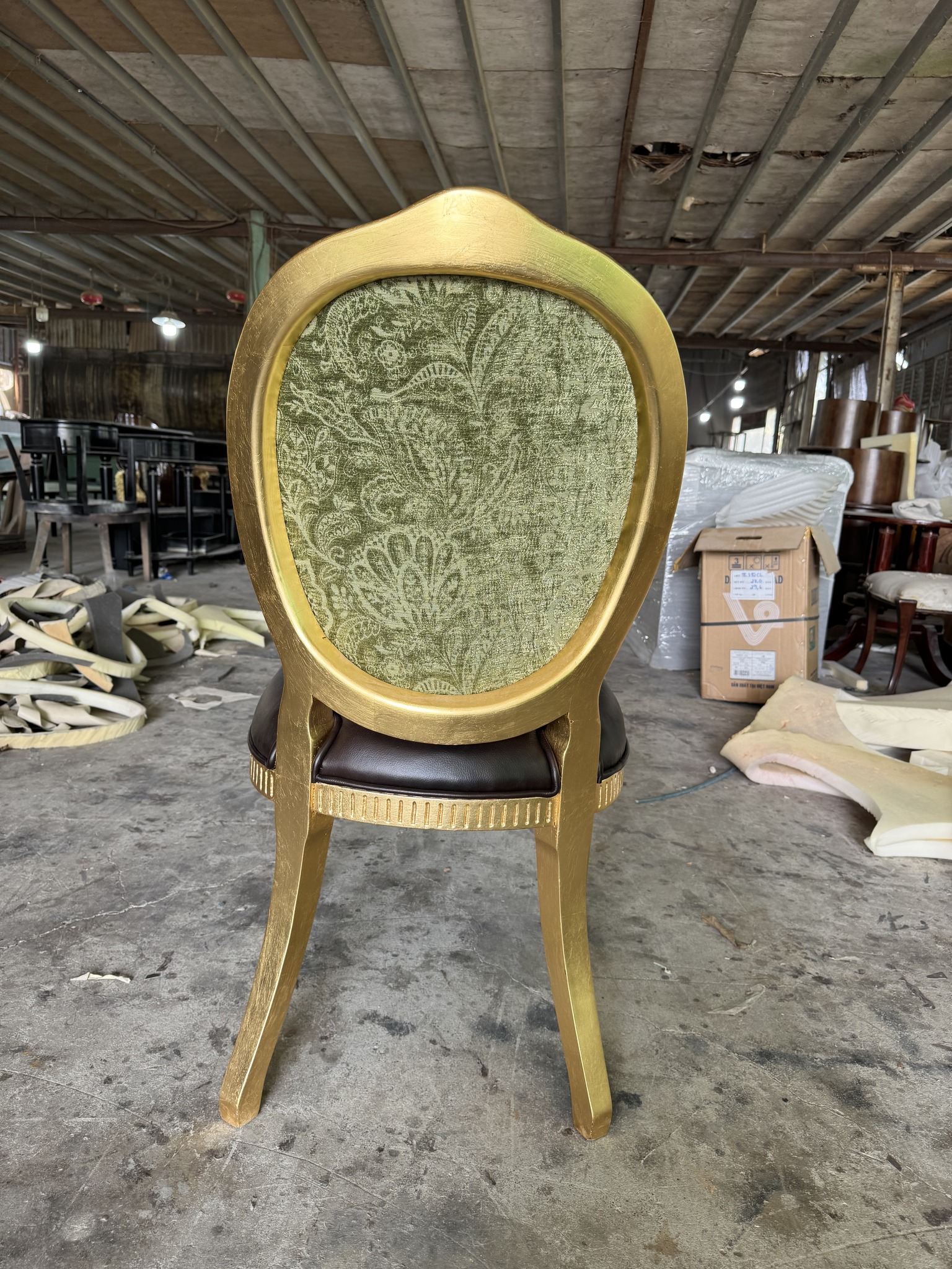 Ghế ăn tựa lưng ovan phiên bản mới dùng gỗ mahogany dát vàng toàn bộ, mê ngồi bọc da bò nhập, tựa lưng bọc vải thêu của acacia - Nội thất Minh Sang