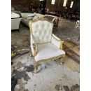 Ghế sofa đơn dùng gỗ mahogany dát vàng hoặc bạc champagne toàn bộ. Ghế bọc vải nhung màu vàng xám nhạt kết hợp rút nút tạo điểm nhấn.