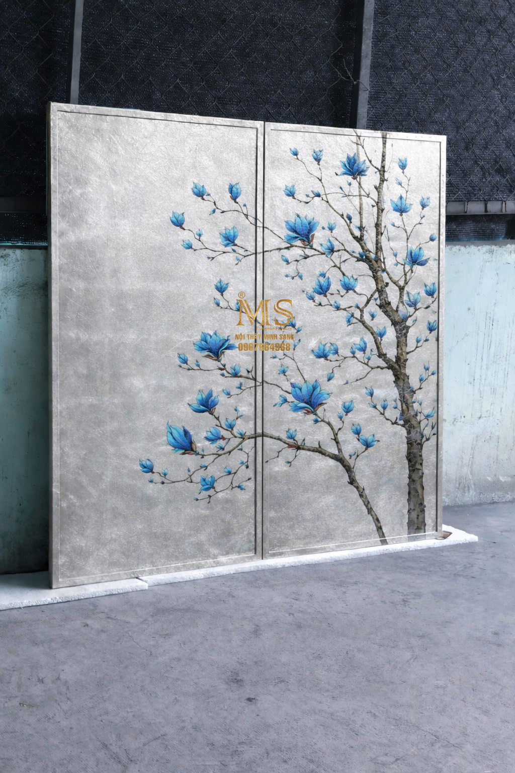 Cặp tranh vẽ cây hoa mộc lan xanh nền lá bạc Ý – Nội thất Minh Sang