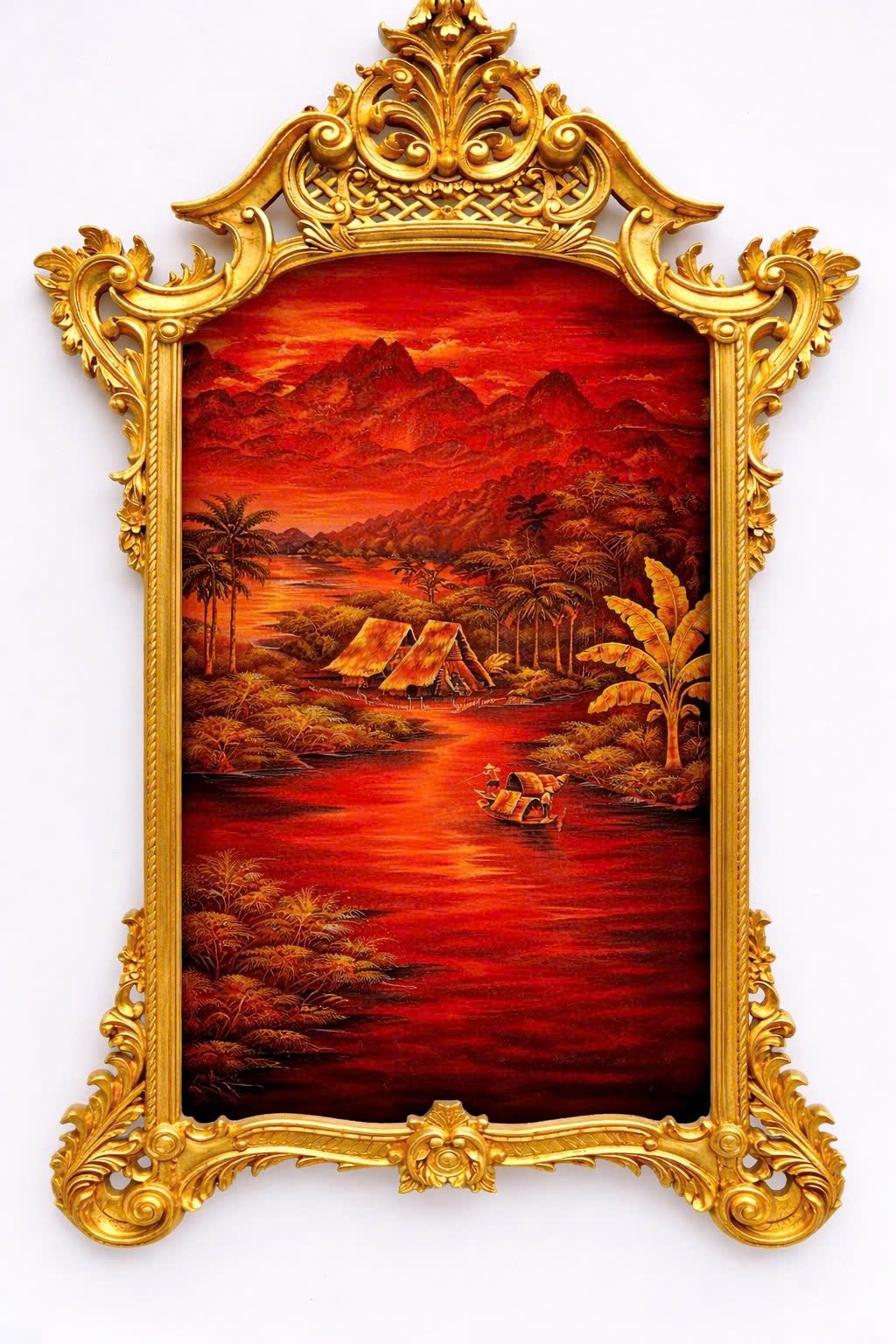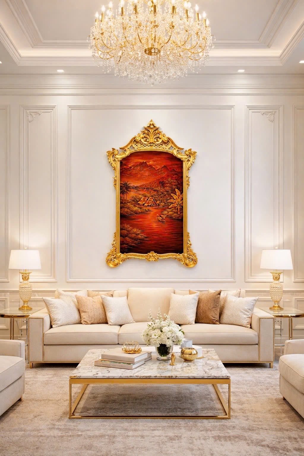 Sự kết hợp giữa tranh làng quê mộc mạc và khung dát vàng sang trọng tạo nên một tổng thể hài hòa, không hề đối lập mà còn bổ trợ cho nhau. Chính điều này giúp tranh làng quê khung chạm trổ dát vàng phù hợp với nhiều phong cách nội thất khác nhau, từ cổ điển, tân cổ điển đến hiện đại pha chút ấm cúng.