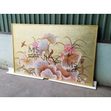 Khung tranh được hoàn thiện với viền dát vàng sang trọng. Lớp vàng ánh nhẹ giúp tôn lên tổng thể bức tranh, đồng thời tạo điểm nhấn nổi bật khi treo trong không gian. Sự kết hợp giữa nền đỏ sơn mài và viền vàng mang lại cảm giác ấm áp, đẳng cấp và hài hòa.