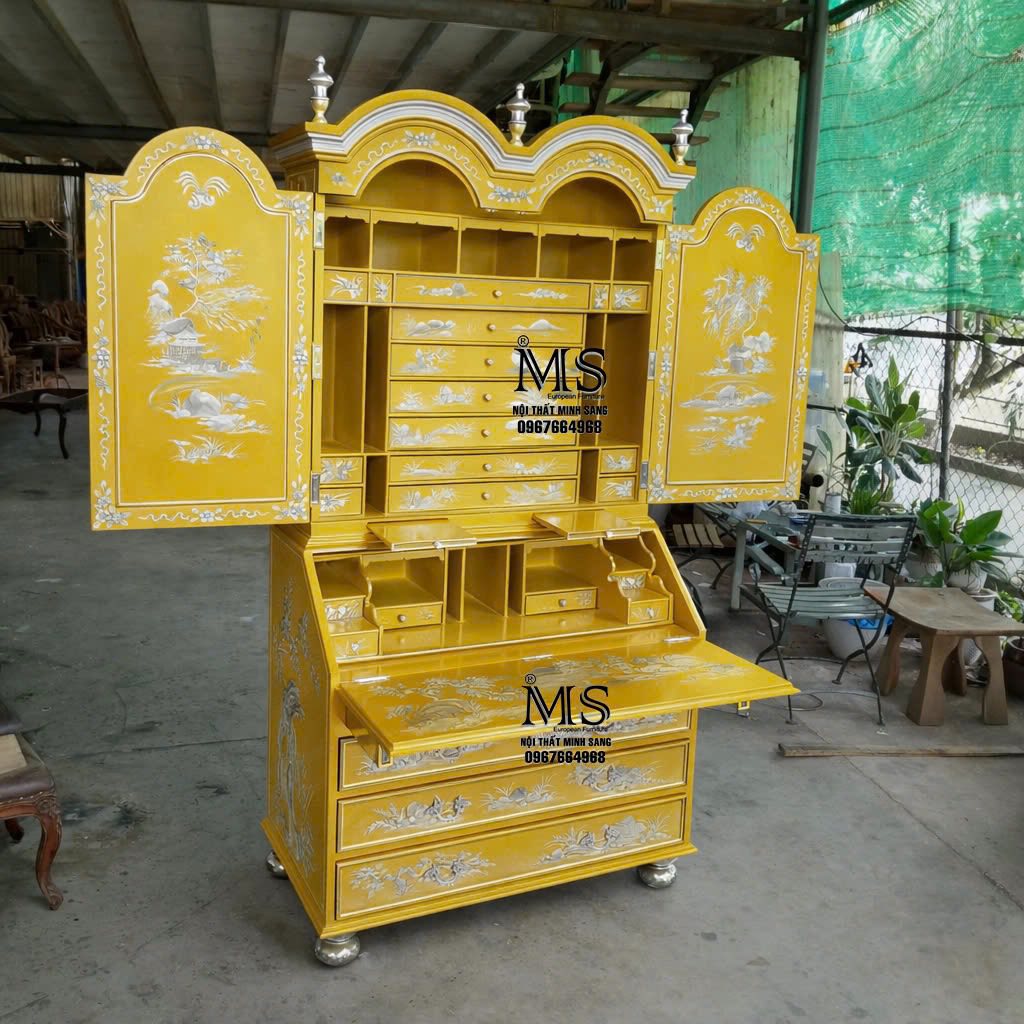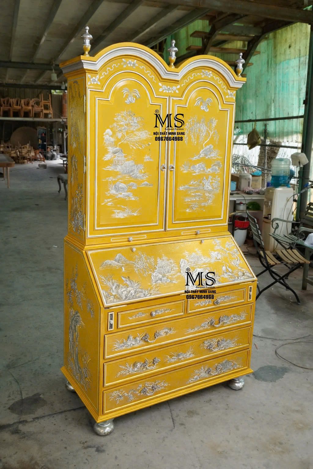 Tủ thư ký (Secretary Desk Cabinet) màu vàng, vẽ bằng nhũ bạc – Nội thất Minh Sang