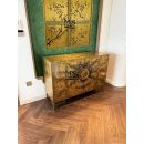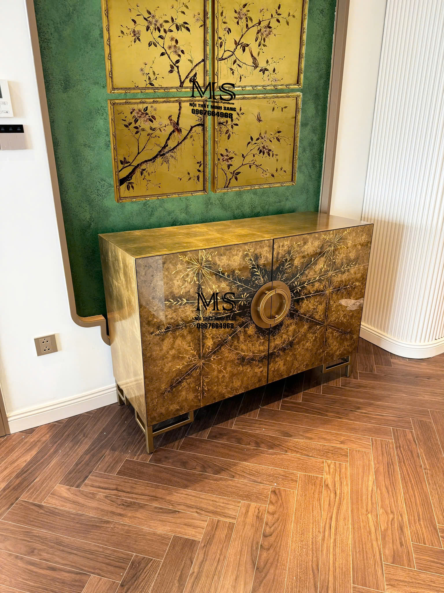 Điểm nhấn đặc biệt của tủ là chi tiết dát vàng tinh xảo, giúp tôn lên vẻ đẹp sang trọng và quý phái. Lớp vàng mỏng phản chiếu ánh sáng nhẹ nhàng, tạo hiệu ứng lung linh và nổi bật, làm tôn lên giá trị thẩm mỹ của món đồ nội thất.