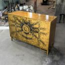 Tủ sử dụng kỹ thuật vẽ ngược trên mặt kiếng, tạo chiều sâu và hiệu ứng ánh sáng tinh tế. Họa tiết vẽ tay độc đáo trên nền kiếng làm tủ thêm phần sang trọng và tinh xảo, đồng thời phản chiếu ánh sáng tự nhiên, khiến không gian trở nên rộng rãi, thoáng đãng và nổi bật hơn.