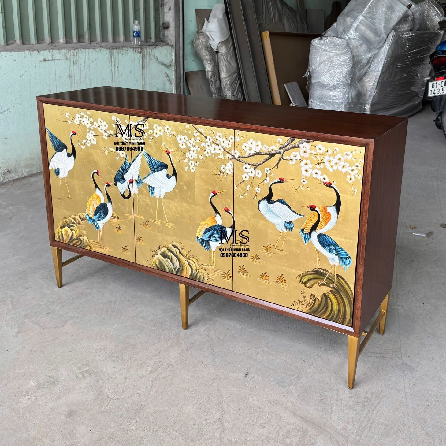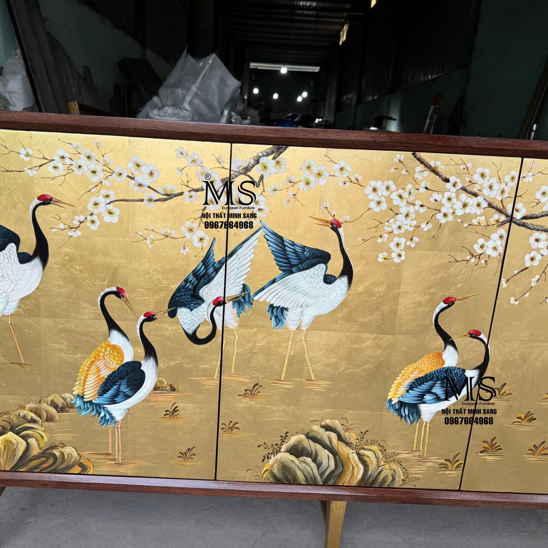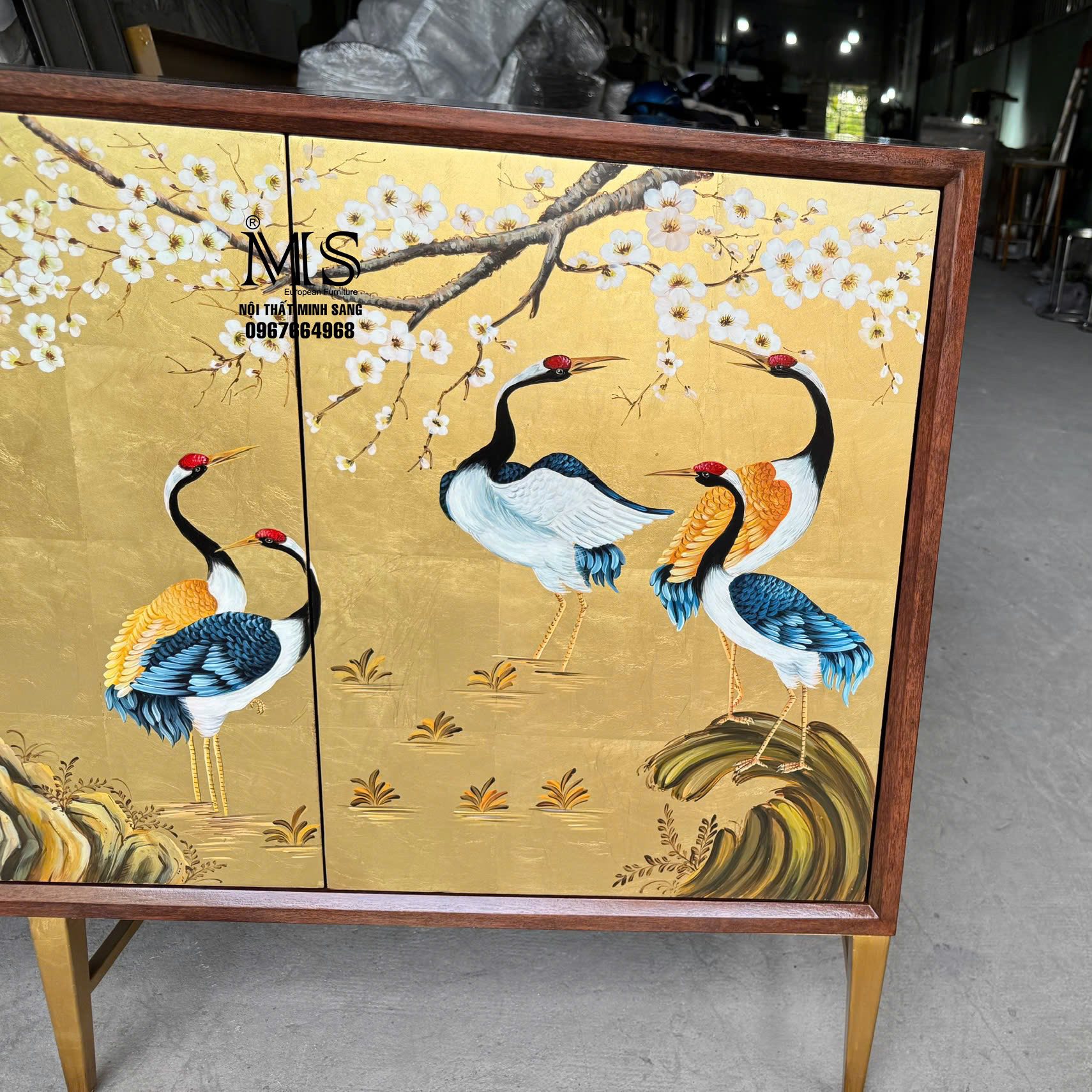 Điểm thu hút nhất của mẫu tủ nằm ở 3 cánh cửa được dát lá đồng và vẽ tay thủ công. Trên nền ánh đồng ấm áp, hình ảnh hoa đào nở rộ xen kẽ cùng bầy hạc đang nghỉ ngơi hiện lên nhẹ nhàng, sống động. Hoa đào từ lâu được xem là biểu tượng của mùa xuân, của may mắn và khởi đầu hanh thông. Trong khi đó, hạc đại diện cho sự thanh cao, trường thọ và bình an. Sự kết hợp hài hòa giữa hai hình ảnh này mang đến ý nghĩa phong thủy tốt lành, giúp không gian luôn tràn đầy sinh khí và năng lượng tích cực.