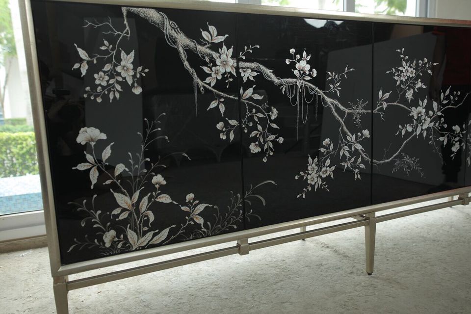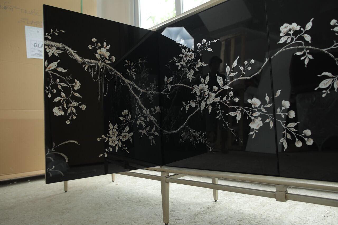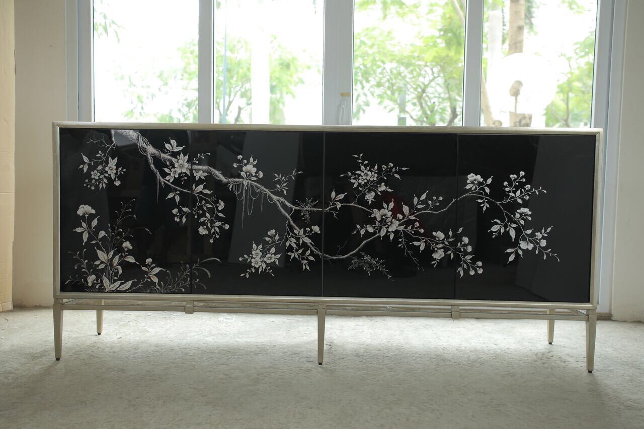 Nền kiếng đen mang lại chiều sâu cho không gian, giúp tủ trở nên nổi bật nhưng không quá phô trương. Dù đặt trong phòng khách, phòng ăn hay sảnh lớn, tủ cành cây vẽ ngược kiếng đen vẫn tạo được ấn tượng mạnh ngay từ ánh nhìn đầu tiên.