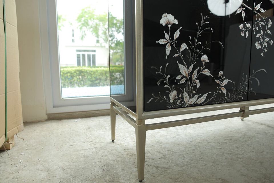 Nhờ gam màu đen tinh tế kết hợp hoa văn nghệ thuật, tủ dễ dàng hòa hợp với nhiều phong cách nội thất khác nhau, từ hiện đại đến bán cổ điển.