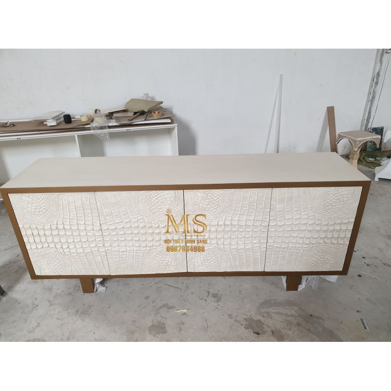 Tủ có 04 cánh cửa ốp resin sóng lưng da cá sấu lớn làm màu trắng ngà. Thân tủ dùng veneer Oak quarter, chân và viền cạnh dán lá đồng lau glaze. Tủ dùng tip-on của Blum để mở cửa.