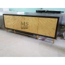 Tủ dùng veneer Black walnut bên ngoài, bên trong dùng walnut. 04 cánh cửa resin tạo hiệu ứng mặt trời đang tỏa sáng, từng tầng từng tầng ánh sáng soi rọi khắp muôn nơi. Chân kim loại dán lá đồng lau glaze hạ màu, tủ dùng bản lề và tip-on của Blum để mở cửa.