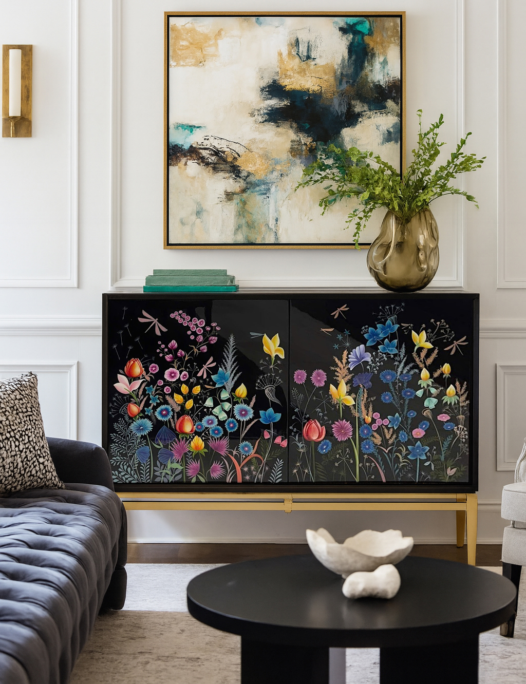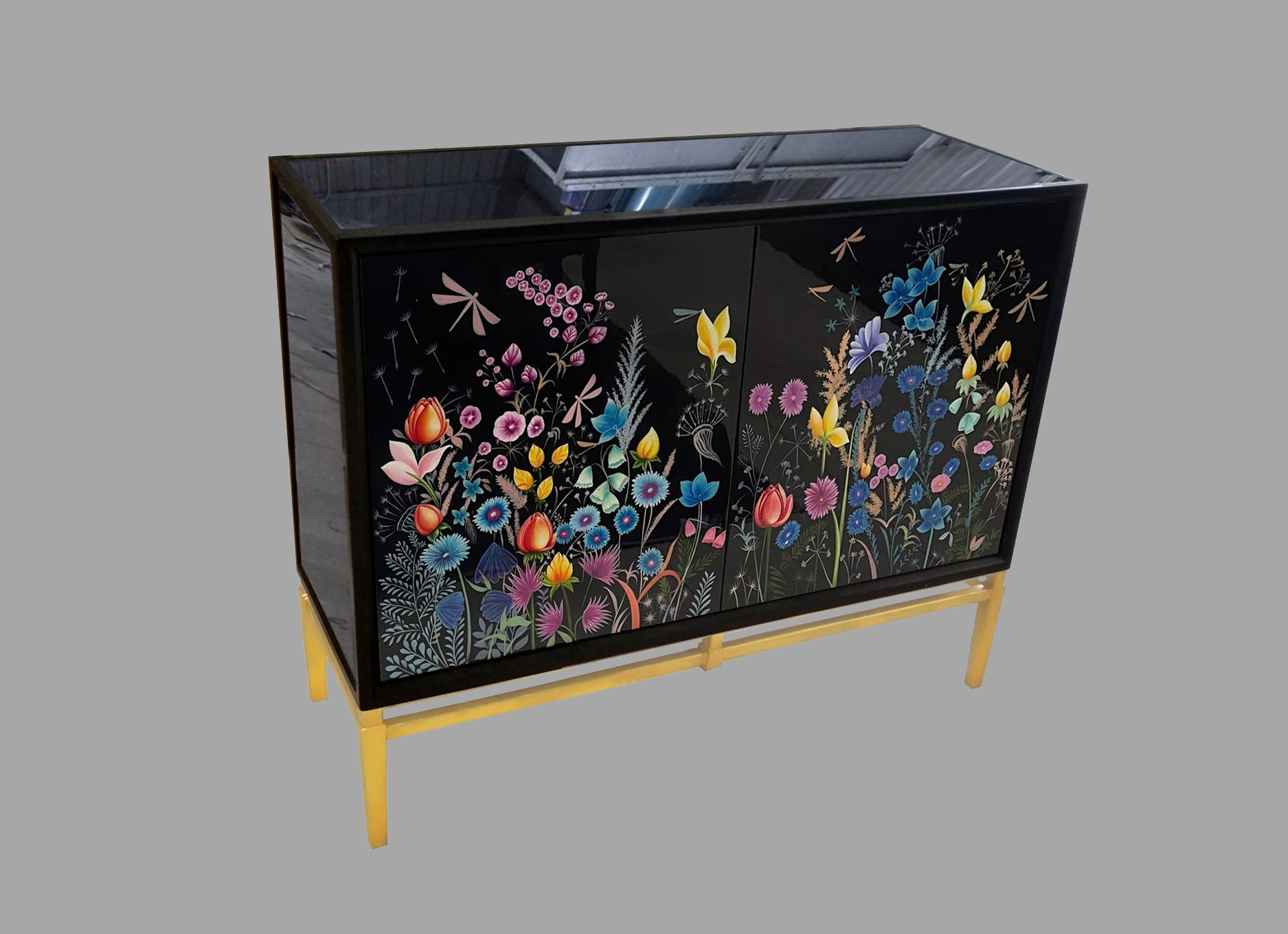 Tủ có chỉ gỗ sơn đen tuyền, 02 hông và nóc tủ ốp kiếng đen, 02 cánh cửa vẽ ngược những cánh hoa đêm trên nền kiếng đen. Chân tủ dát lá đồng lau glaze đậm nhạt.