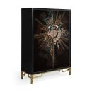 Một chút nghệ thuật được vẽ trải đều trên mặt của 02 cánh cửa. Thân tủ dày chắc chắn và sơn đen tuyền, bên trong có 02 tầng kệ di động và nhiều hàng lỗ đỡ kệ. Chân kim loại dán lá đồng quét glaze giả cổ. Tủ dùng nêm bấm bật của Blum kết hợp với bản lề không giảm chấn để đóng mở cửa.