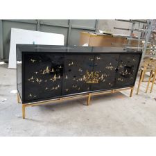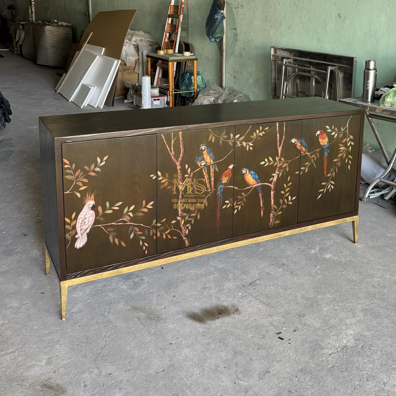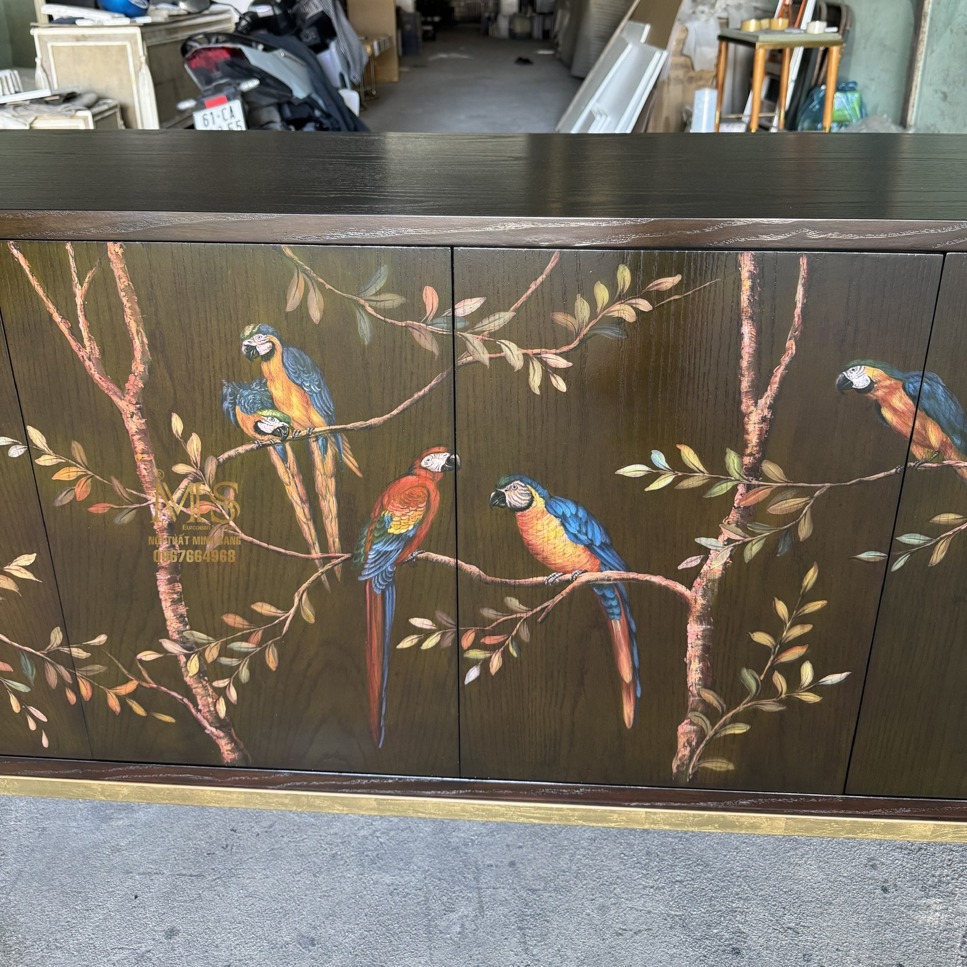 Bề mặt veneer ash được hoàn thiện màu nâu đen theo yêu cầu riêng, kết hợp họa tiết vẽ tay những chú vẹt nhiều màu sắc đang đậu thư thái trên các cành cây, tạo nên điểm nhấn sinh động và đầy cảm xúc. Chân tủ dát lá đồng lau glaze, ánh kim trầm ấm, tôn lên vẻ sang trọng và tinh tế cho không gian sống.